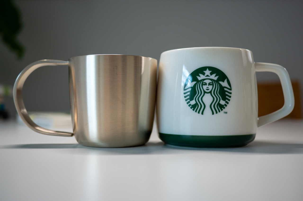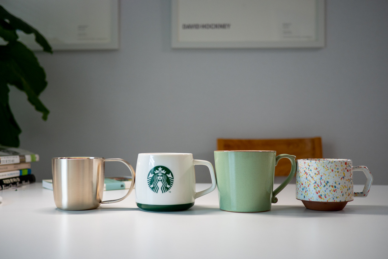 기존에 자주 사용하던 스타벅스 머그컵과 크기를 비교해보았다. 넓이과 높이가 조금 씩 작다. 개인적으로 기본 사이즈의 머그컵 보다 더 큰 머그컵을 선호하기에 이 부분은 다소 아쉬웠다.