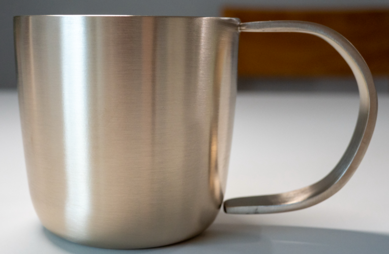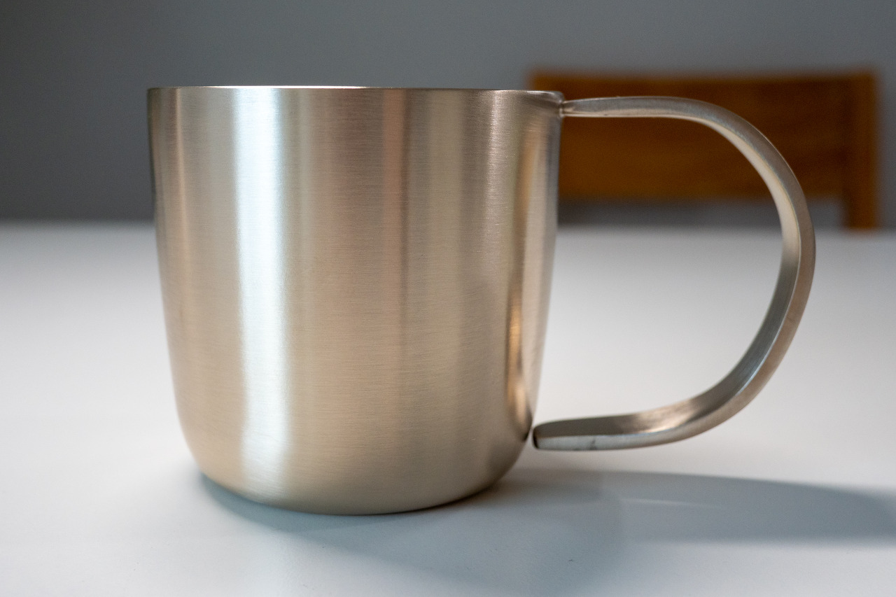 놋담 '반달 머그컵'은 기존의 어떤 물잔에 손잡이를 반달 형태로 용접하여 붙인 것 같다. 본체의 마감이 상당히 우수하다.