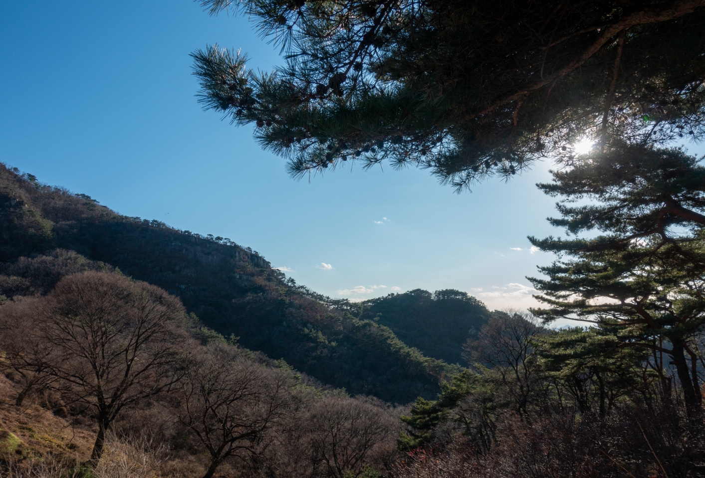 낙엽송의 잎이 없는 겨울산은 또 다른 풍취가 있다.