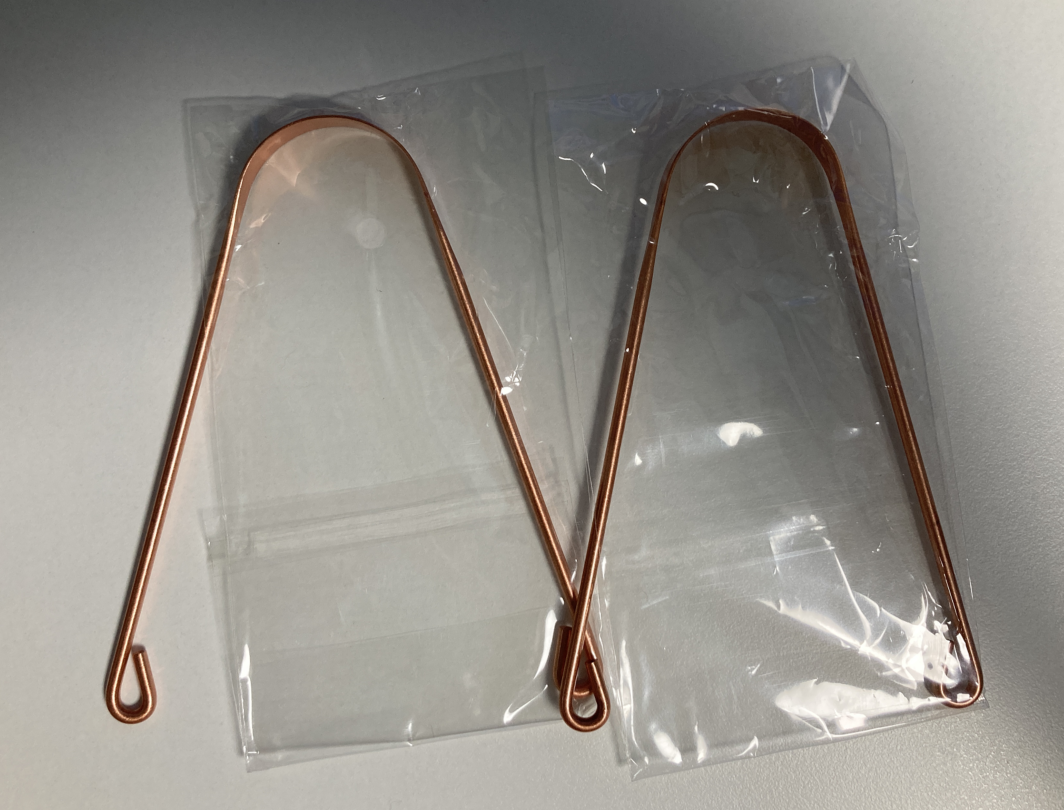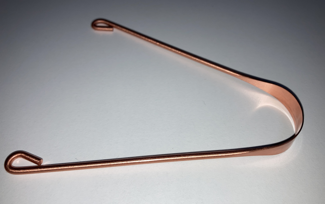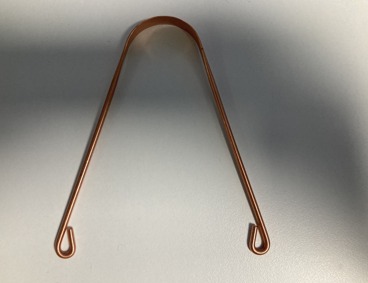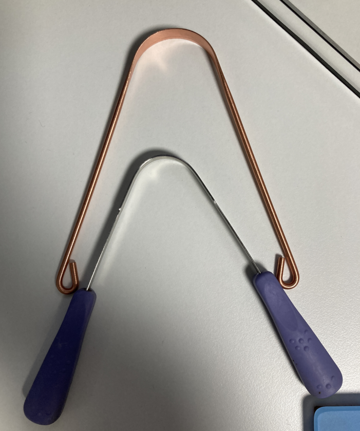 구리 혀 클리너, 전체가 순수 구리로 제작되어 있다. 그래서 손잡이 부분은 조잡한데 날카로운 부분이 없어서 잡는데 문제는 없다.