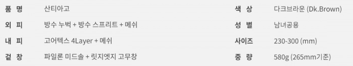 캠프라인의 산티아고란 모델이다. 브라운 색상이 흙이 묻었을 때 무난하다고 한다. 발목을 완전히 감싸는 제품은 아니다.
