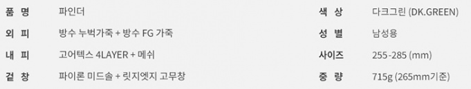 캠프라인 파인더의 다크그린 모델이다. 발목을 완전히 감싸는 구조다. 왠지 무거울 것 같다. 자주 산행을 안하지만 전문적인 등산화를 구입한다면 고려해볼만하다.