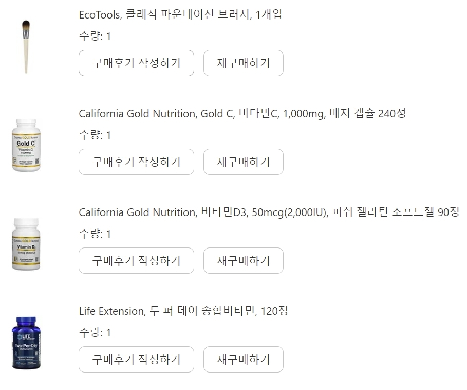 이번에 아이허브에서 구입한 제품 리스트이다. 순서대로, 키보드 키판 청소를 위한 솔 구매, 비타민C 구매, 비타민D 구매, 종합비타민...