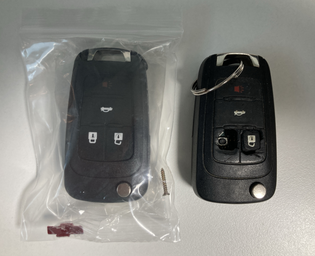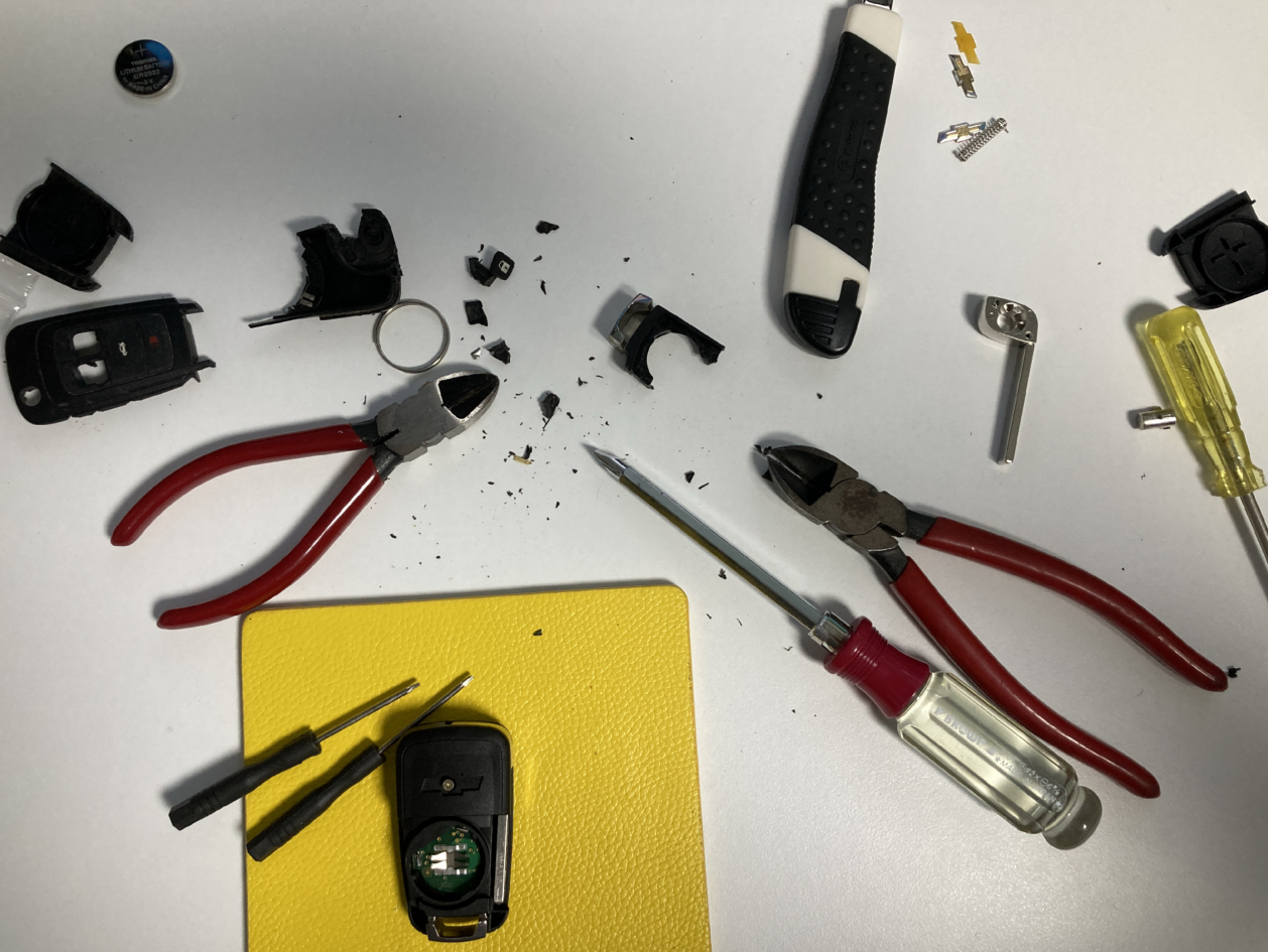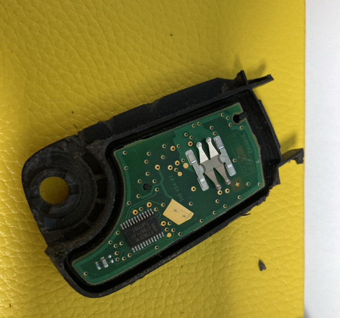 기존의 스마트키를 도구를 사용해서 뜯은 모습이다. 상당히 견고해서 분해하기 힘들다.