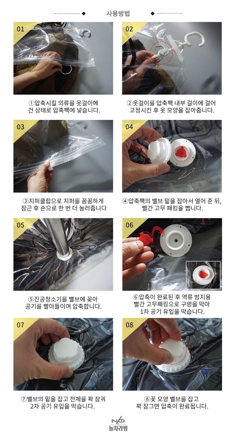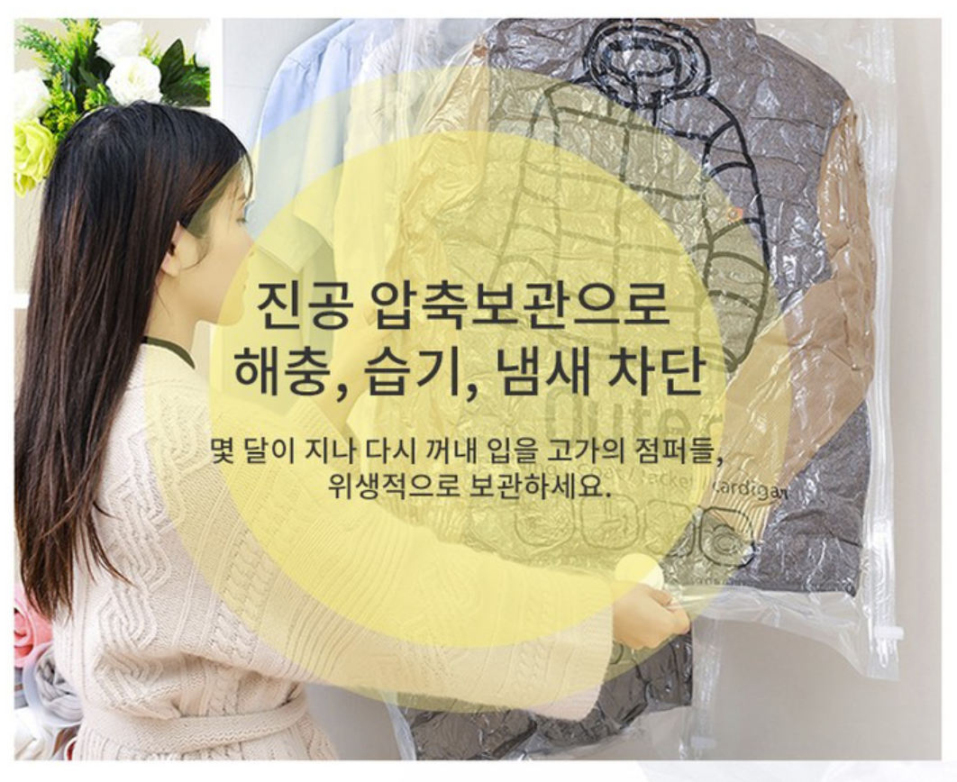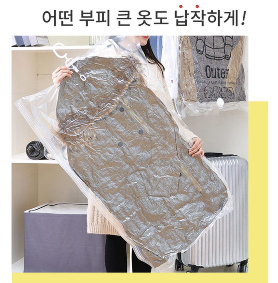 롱패딩과 오리털 점퍼는 부피가 있어서 옷장의 공간을 많이 차지한다. 진공청소기를 사용하여 압축팩의 내부 공기를 제거하여 부피를 축소하여 보관하는 제품이다.