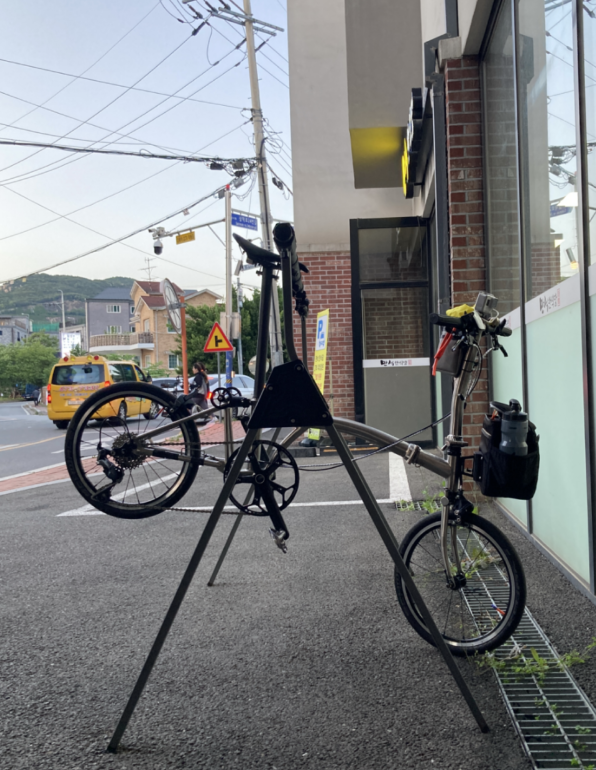 출입구 정문에 자전거를 거치할 수 있는 거치대가 있다. 안에서 투명한 유리로 모니터링 가능하다.