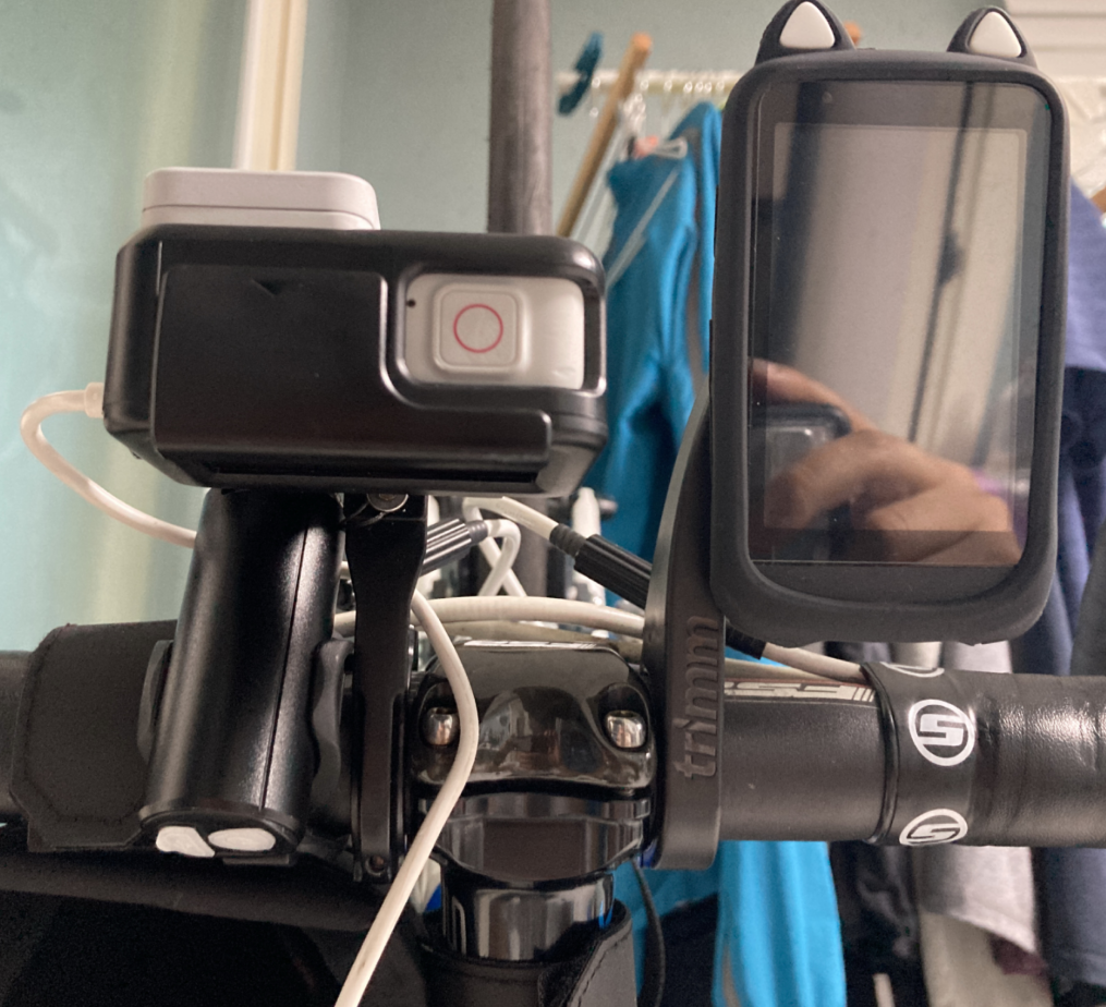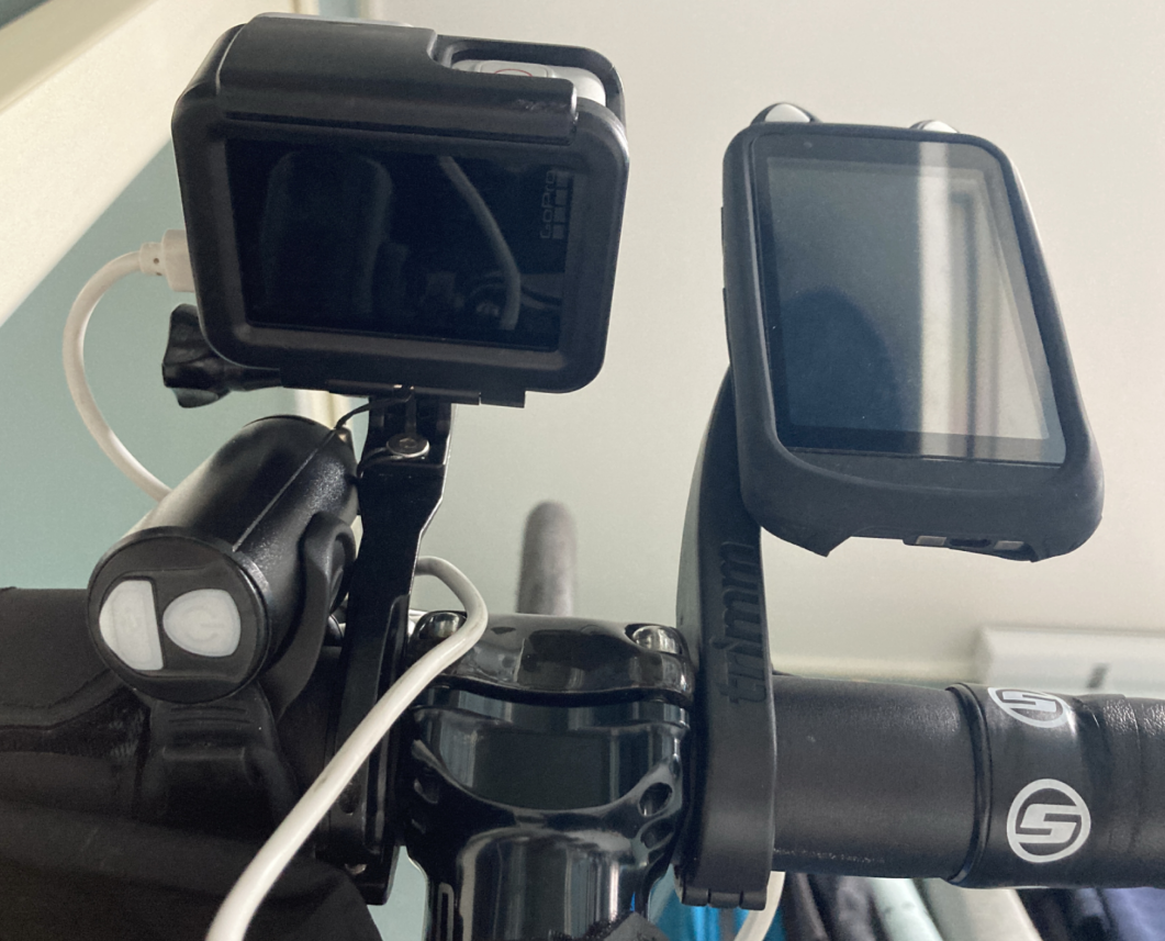 로드자전거에 고프로7과 함께 설치해본 모습이에요. 브라켓은 동봉되어 있는 트림원 것으로 했는데....