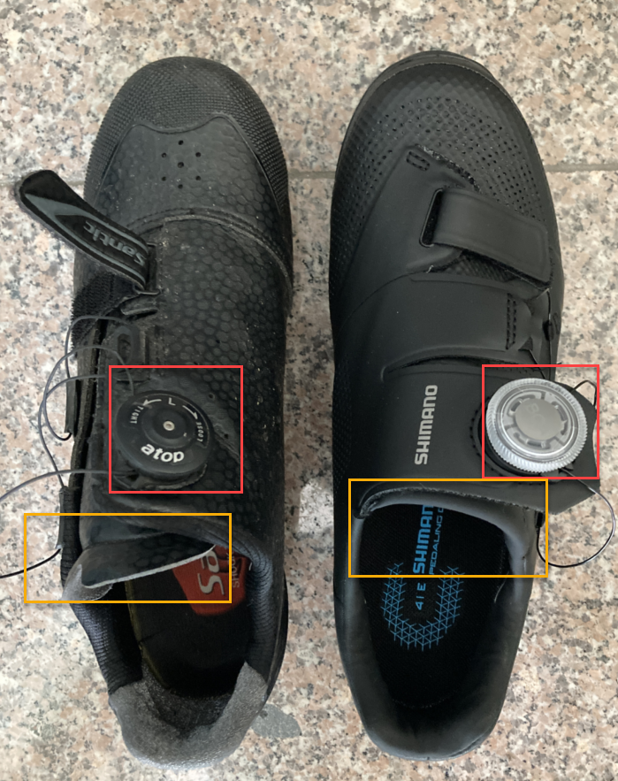 가장 큰 차이는 보아 다이얼의 개폐 방식인데요. 산틱은 역방향으로 풀어야 하지만 시마노는 밖으로 당기면 풀립니다.
