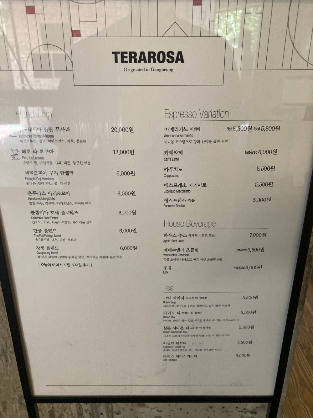 테라로사 커피 메뉴판인데 아메리카노는 아이스말고 따뜻한 것으로 맛봐야 본연의 향과 맛을 느낄 수 있어요.