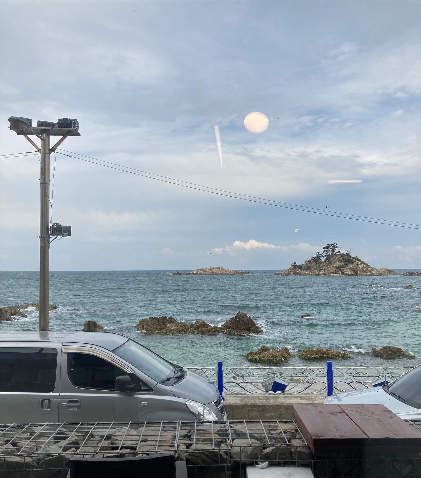 카페 앞의 풍경이에요. 카페 안에서 통 유리 통해서도 바다가 보이는데 살있는 큰 액자를 통해서 보는 것 같은 느낌이 드는 곳입니다.