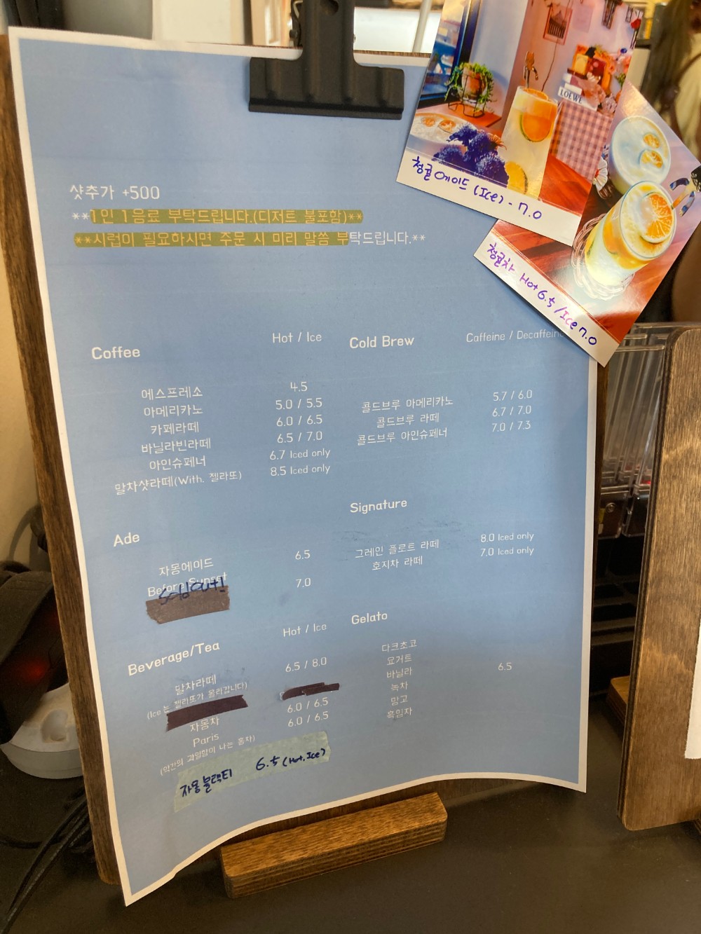 메뉴판인데 커피는 신맛이 느껴지는 정통 바리스타? 맛입니다.
