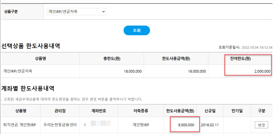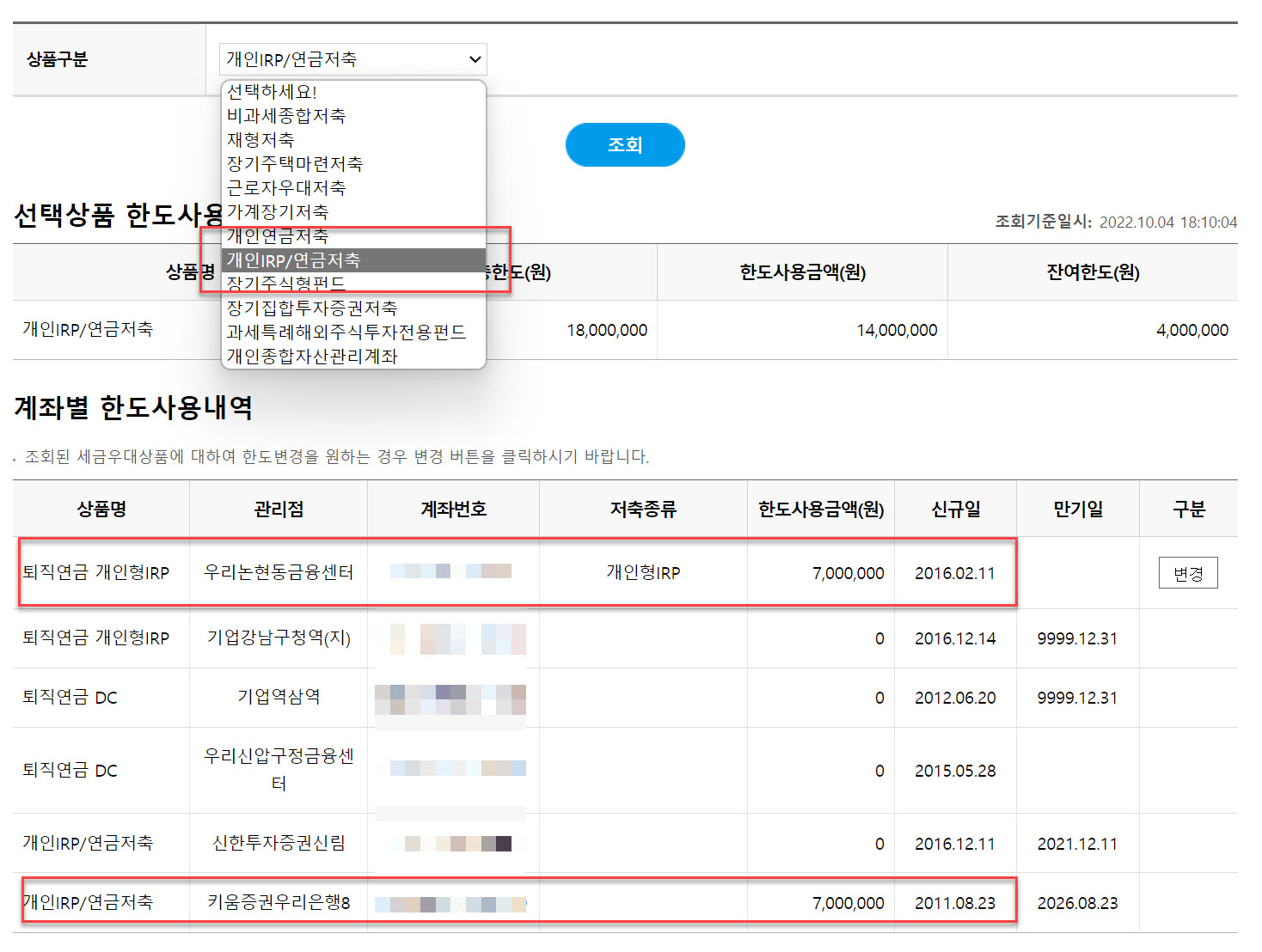 ‘개인IRP/연금저축' 을 선택하고 조회를 누르면 현재 개설된 모든 계좌와 ‘한도사용금액'이 나옵니다.