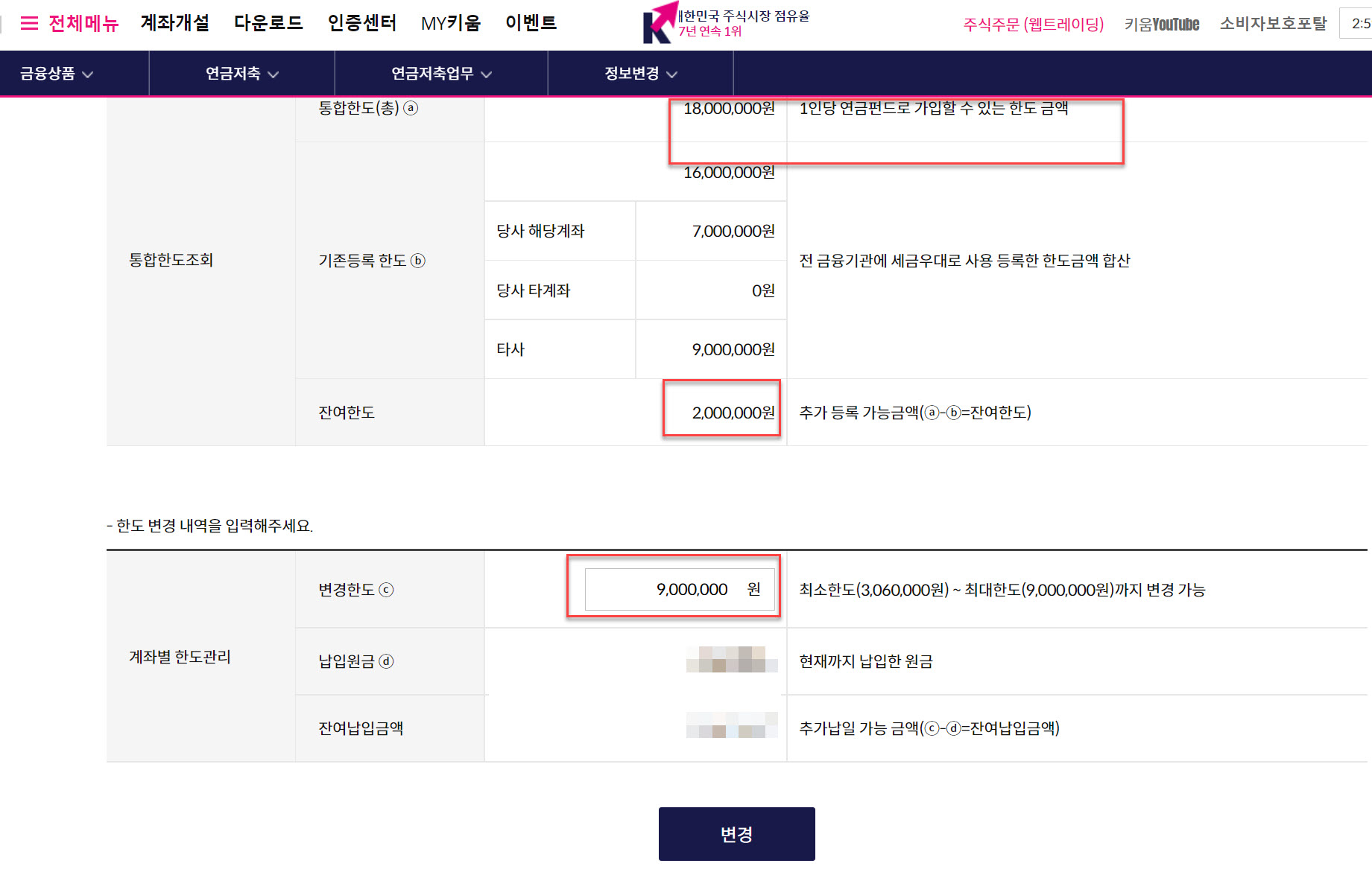 마찬가지로 키움증권의 연금저축도 한도를 기존 700에서 900으로 변경 시도했습니다.  업무 시간외에는 변경이 안되더군요.