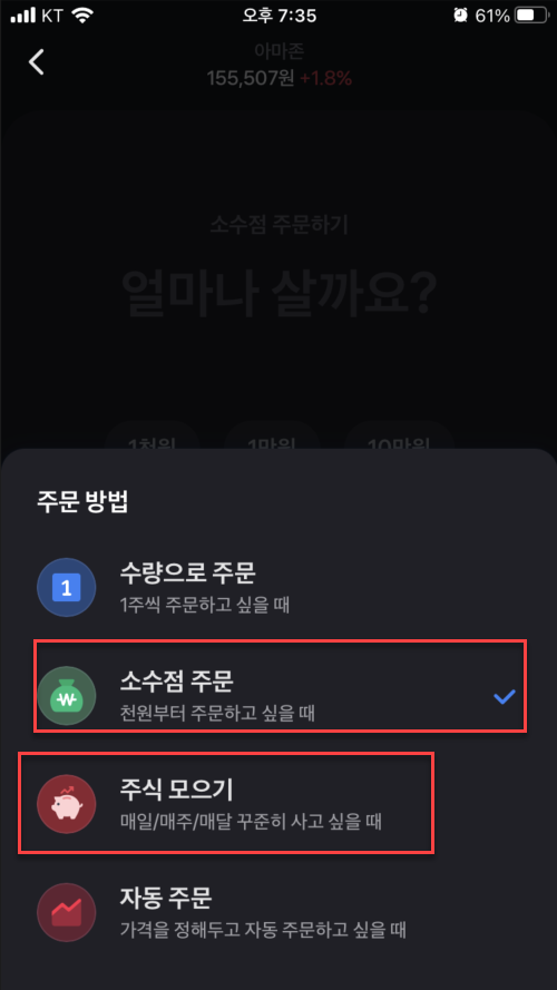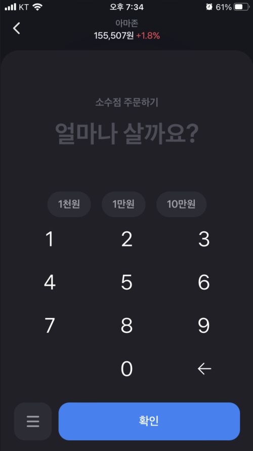 ‘아마존' 주식을 매수 시도하니 바로 ‘소수점 주문하기'로 안내합니다.