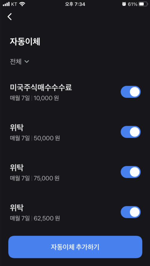 적립식은 매수가 되면 ‘자동이체' 추가 메뉴가 자동으로 나옵니다.