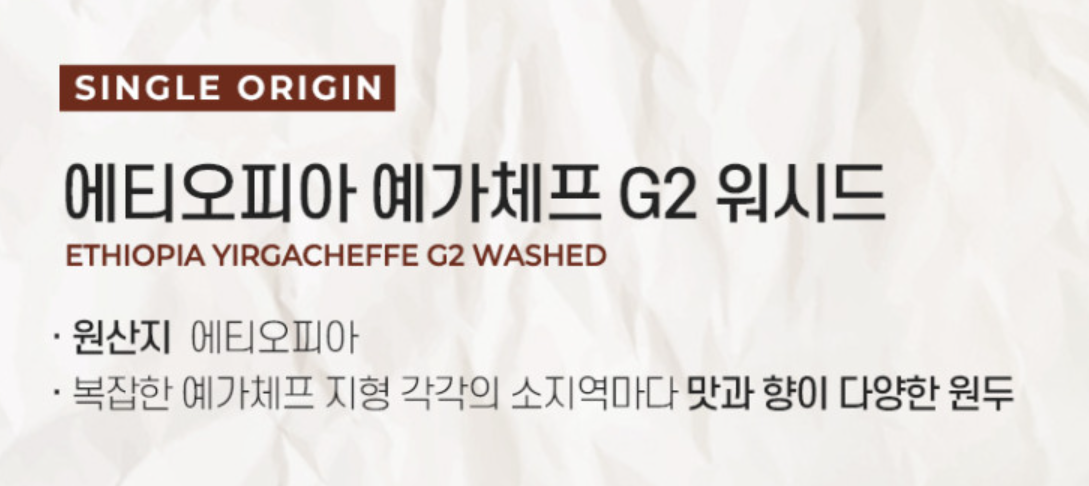 싱글오리진 에티오피아 예가체프G2 워시드 로스팅 원두커피 - 재구매 예정 제품