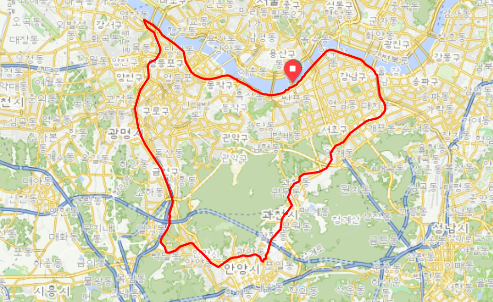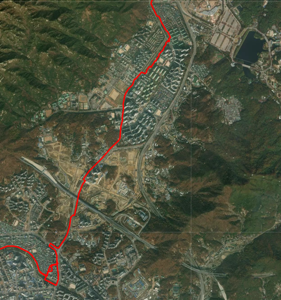잠실 탄천 도착, 탄천을 기점으로 다시 아래 방향, 과천, 안양을 경유하게 됩니다.