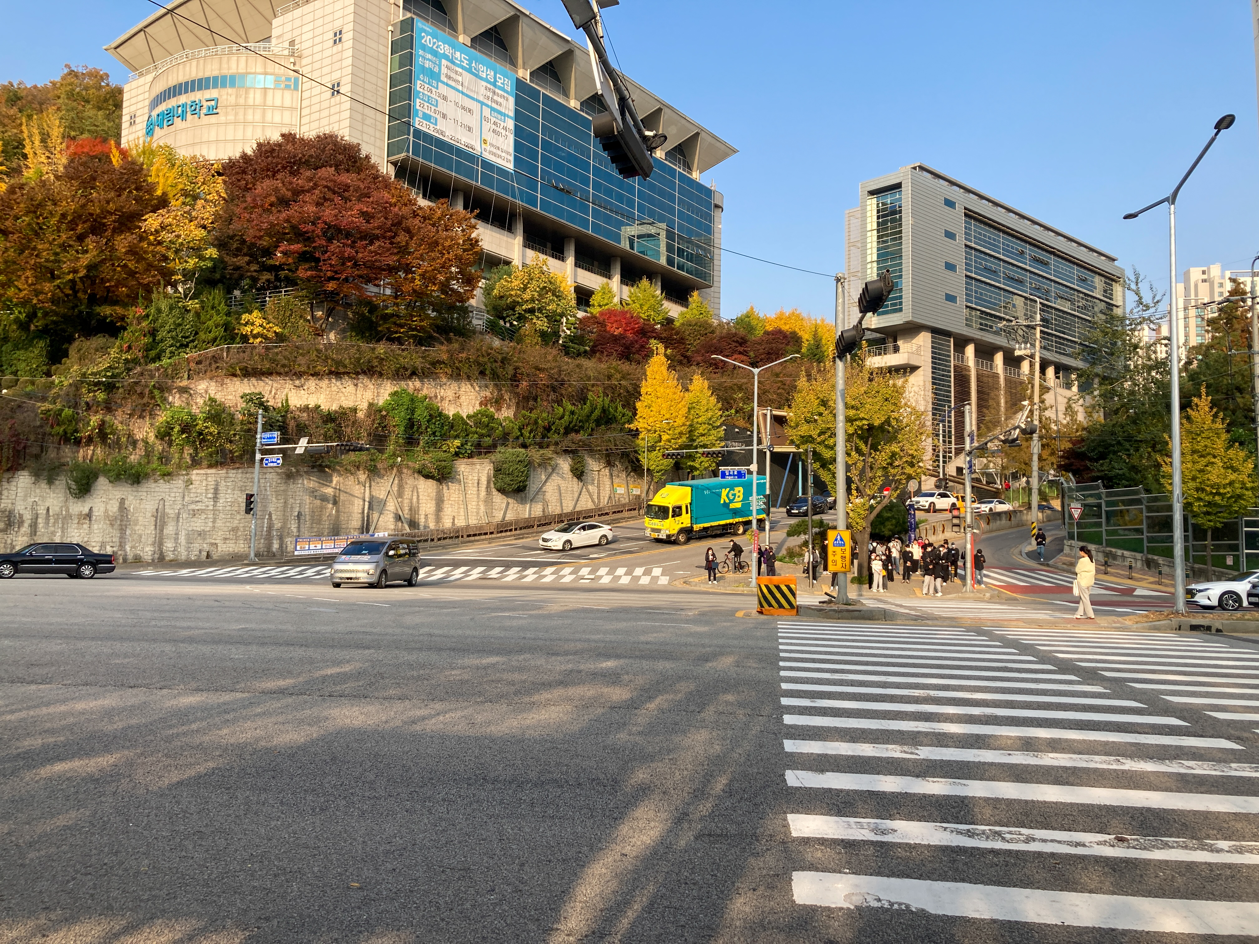 망해암 업힐을 위해서 안양천 자전거도로에서 빠져나와 횡단을 기다리는 모습입니다. 전방에 대림대학교가 보이네요.