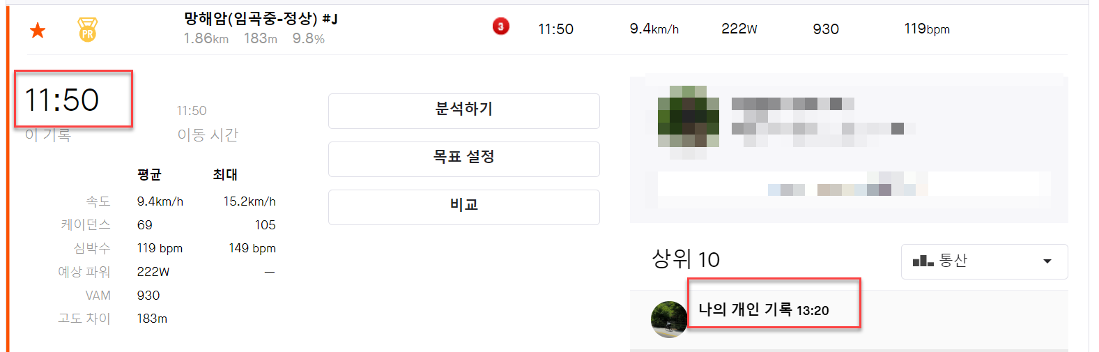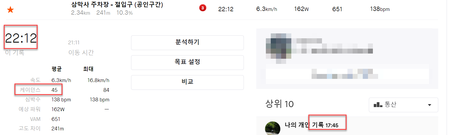 확실히, 업힐의 포인트는 케이던스입니다. 망해암에선 거의 70 나왔는데 삼막사에선 45가 나왔습니다.