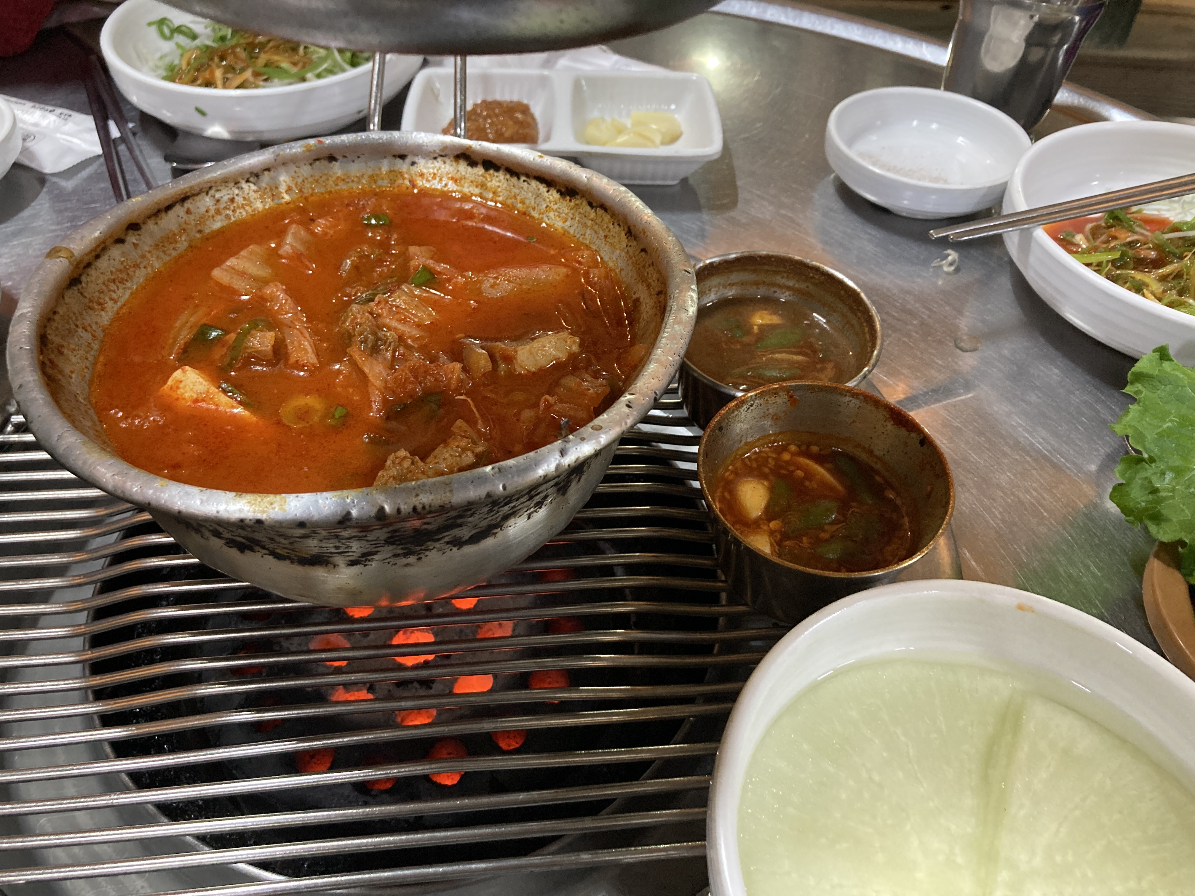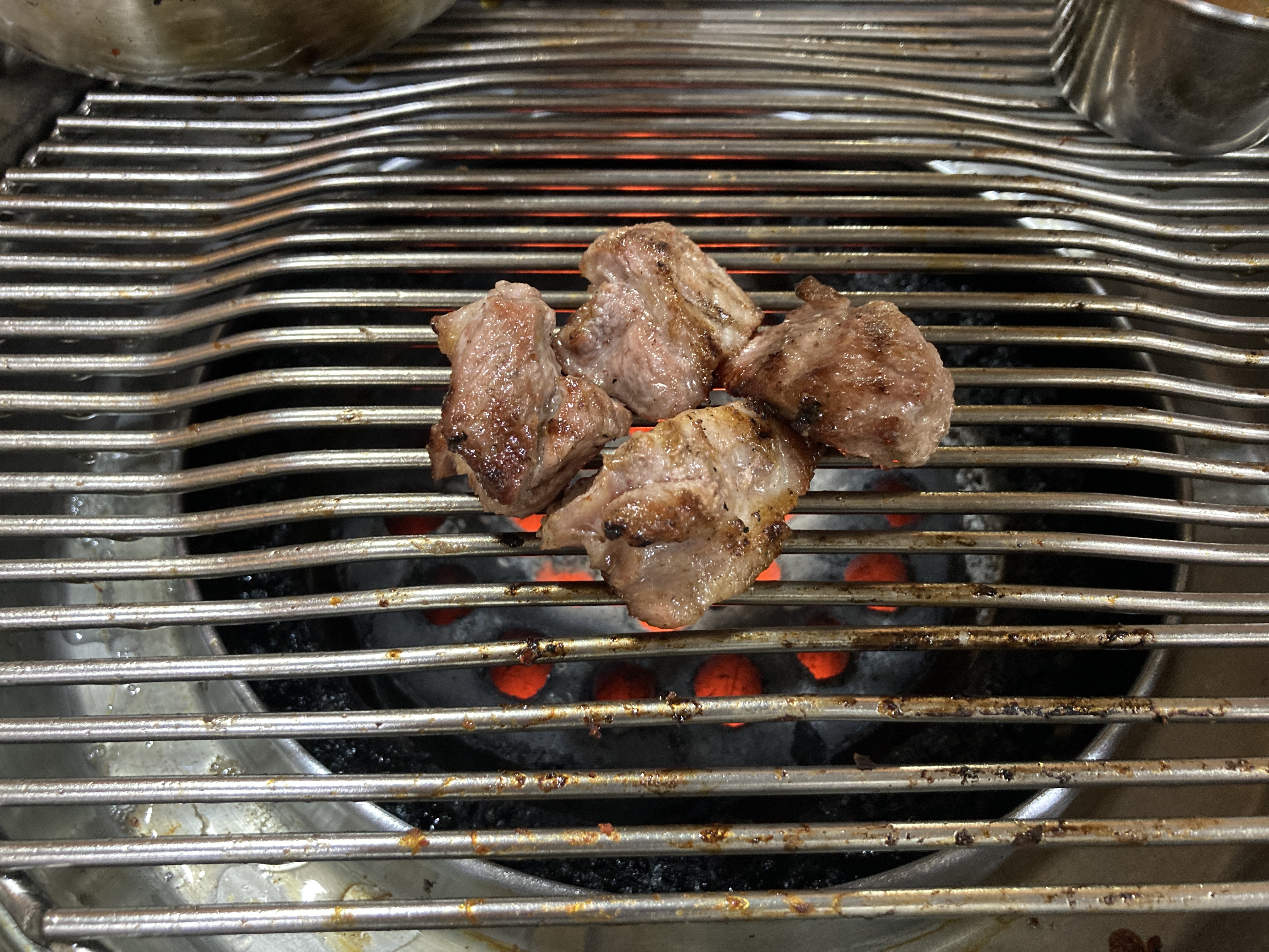 고기는 밖에서 구워서 연탄불 위에 올려준다. 그래서 바로 먹을 수 있다.