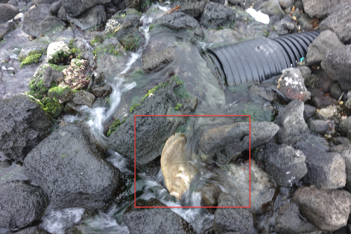 고양이 한 마리가 큰 광어를 입에 물고 뒤뚱거리며 걸어가고 있는 모습을 포착했다. 어디서 잡았는가 했는데 저기 배수로가 양식장으로 이어져 있다. 방문했을 당시 광어 2마리가 배수로에 끼어 있었다. 하얀색 고양이를 위해서 나머지 광어 한 마리를 건져 바위 위에 올려주었다.