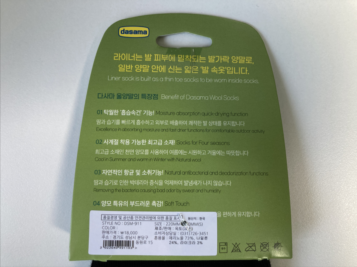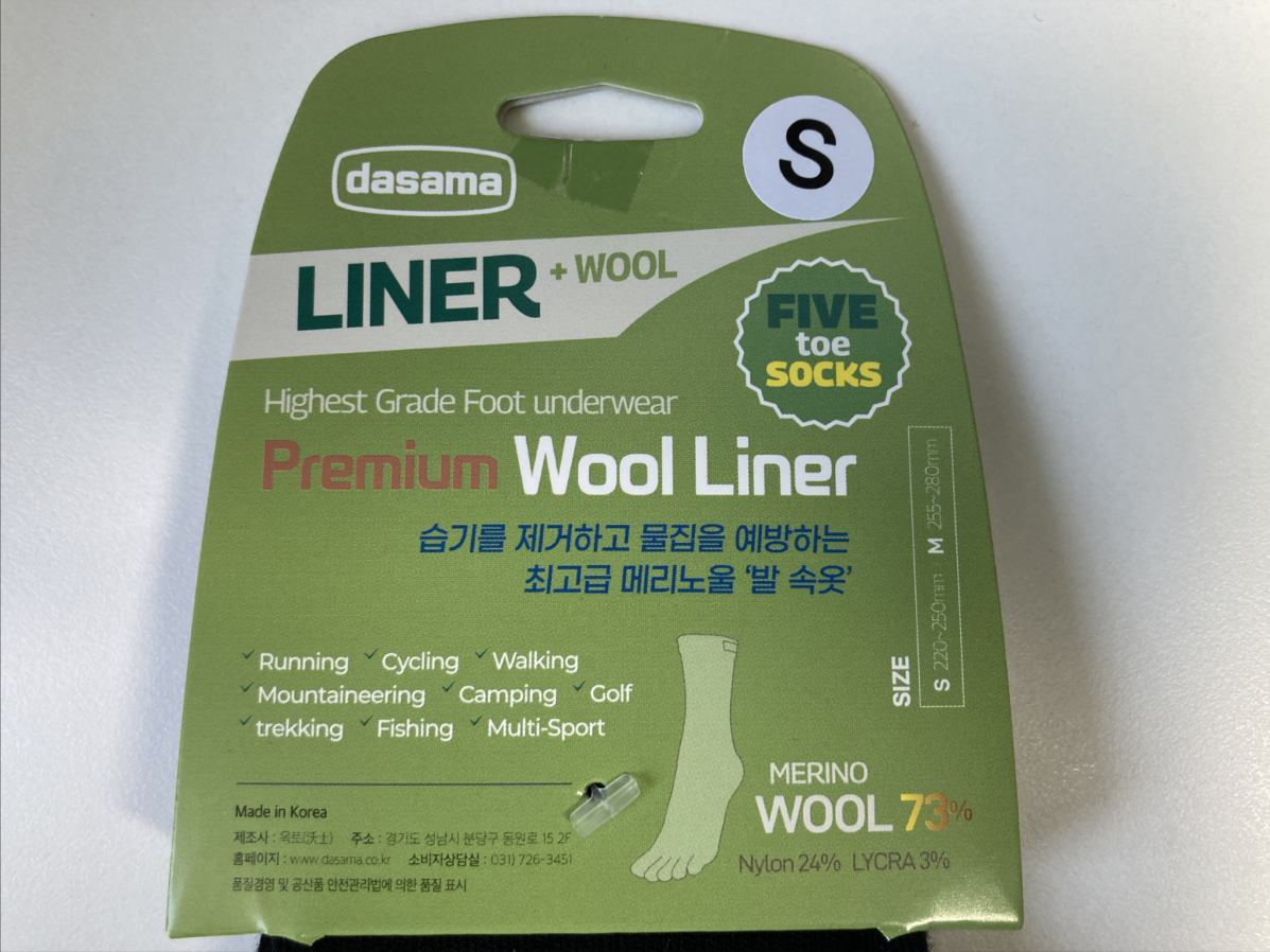 다사마의 라이너 양말인데 일반 양말 안 쪽에 먼저 착용하는 양말입니다. 하지만 충분히 두껍기 때문에 그냥 양말로 사용해도 무방합니다.