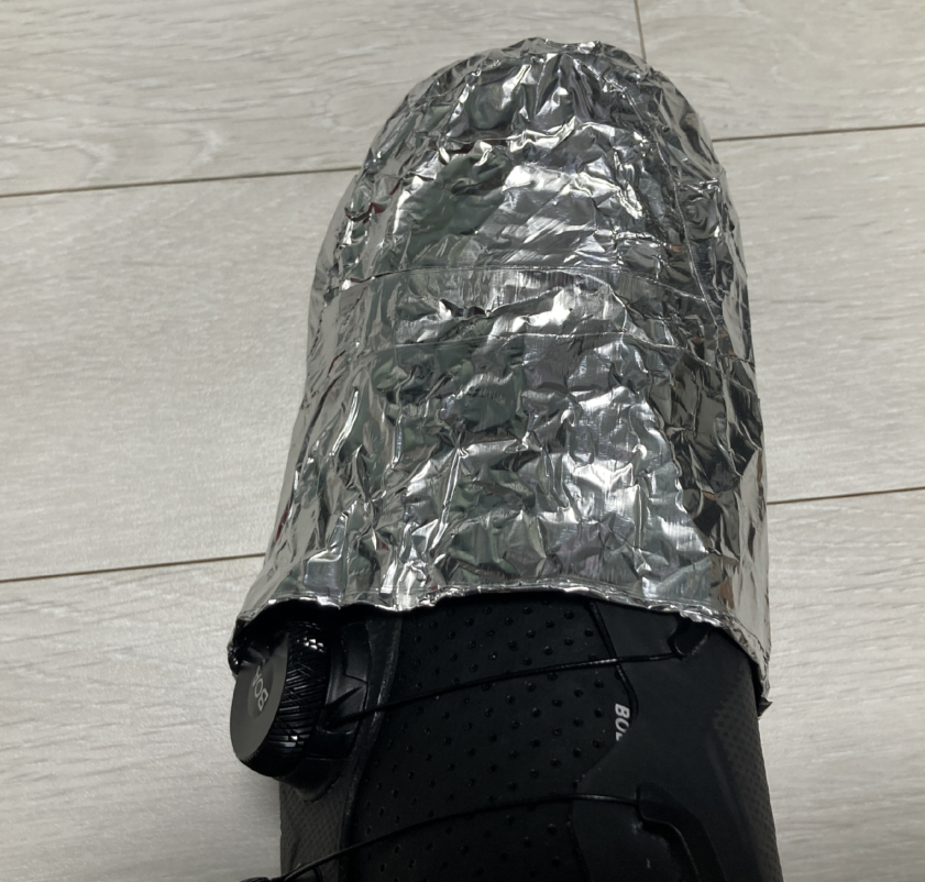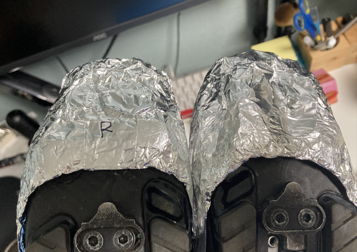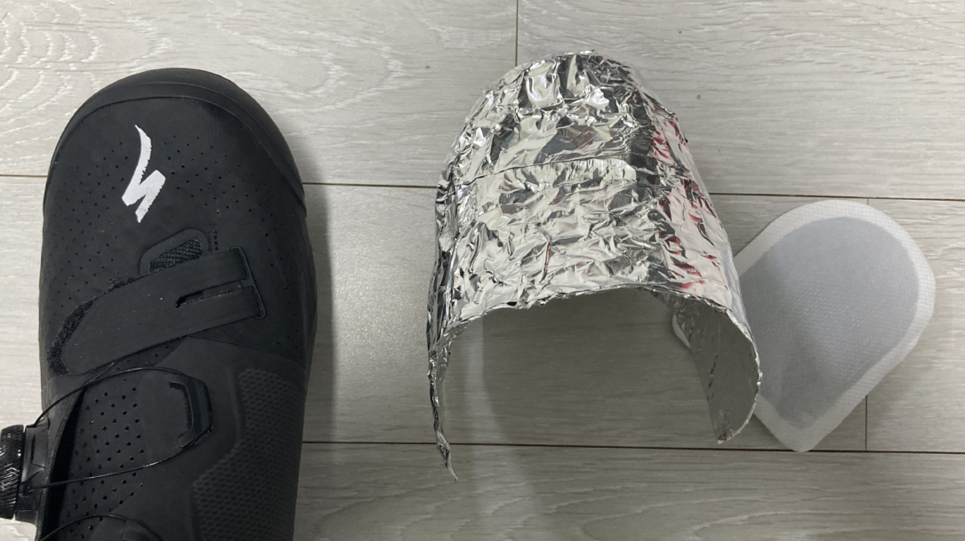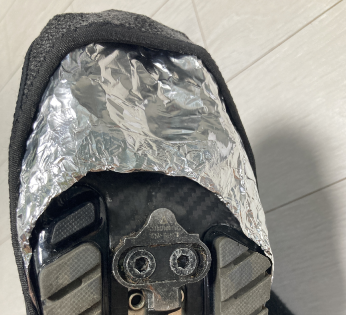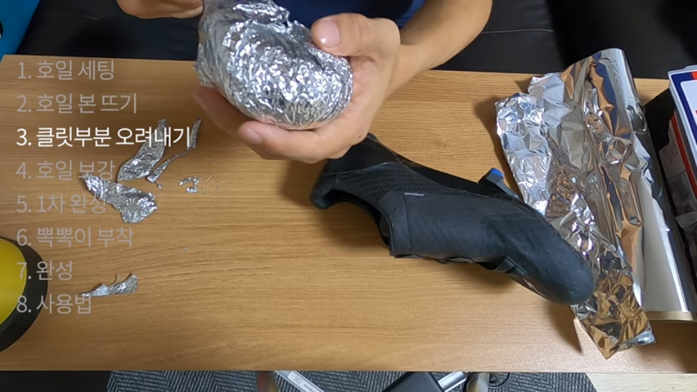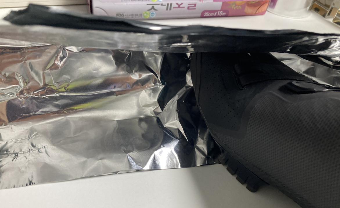 호일을 적당히 잘라서 4겹으로 겹칩니다. 클릿 슈즈 앞 부분과 밑 부분을 감싸 정도면 됩니다. 대략, 25cm 정도
