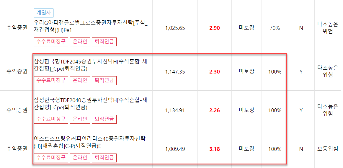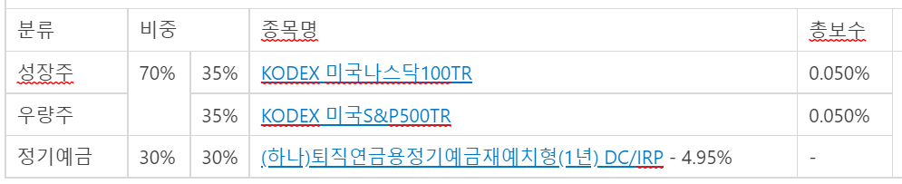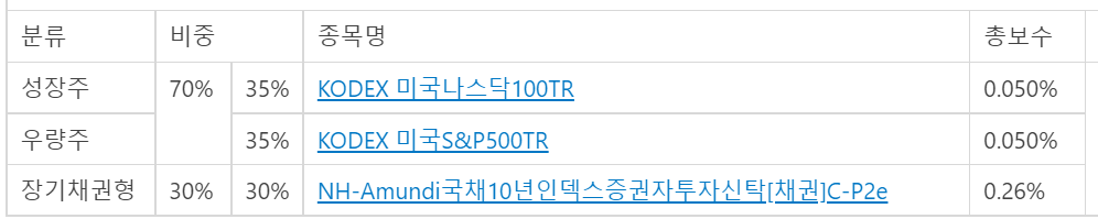 즉, 안전자산 30%는 원리금보장의 고금리 상품 또는 3, 6, 9, 12 주기로 기존 펀드의 수익률과 최근 6개월 높은 수익률 펀드 비교 후 리밸런싱 결정, 총보수가 낮아야 함DF를 선택하지 않은 이유는 총보수가 높음