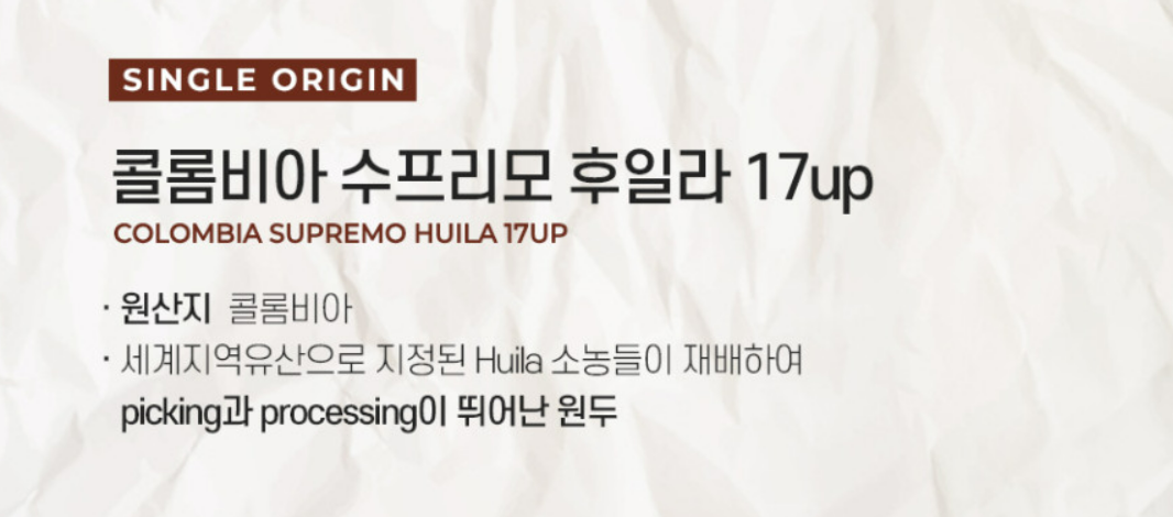 원두 구매 - 싱글오리진 콜롬비아 수프리모 후일라 17up 로스팅 원두커피(재구매 예정)
