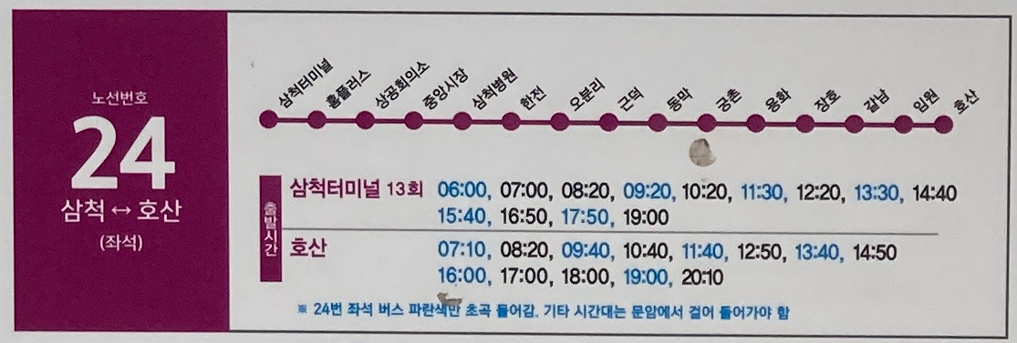 삼척 24번 버스, 삼척에서 호산, 호산에서 삼척 버스 시간표 및 소요 시간