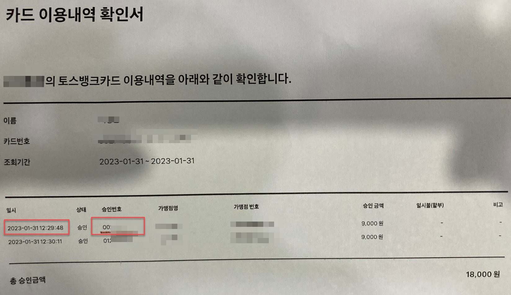 - pdf 출력하여 해당 가맹점 방문하여 토스카드로 12시30분 건 승인 취소함(29분 건은 가맹점에서 승인이 안된 것으로 나오기에 30분 것으로 취소)