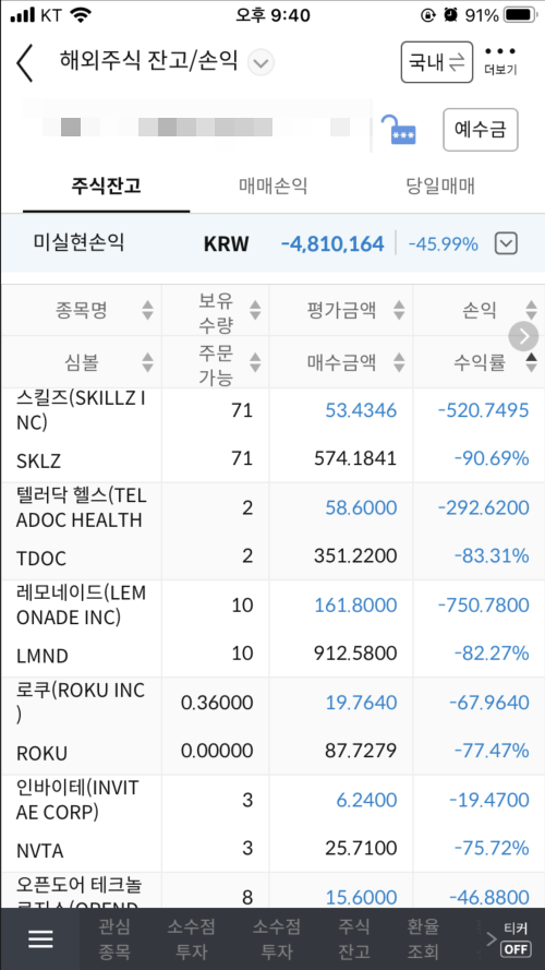 ‘신한투자증권' 이용 시 매수 했던 모습이다. 최근 주가 상승으로 -45%까지 올라갔다.