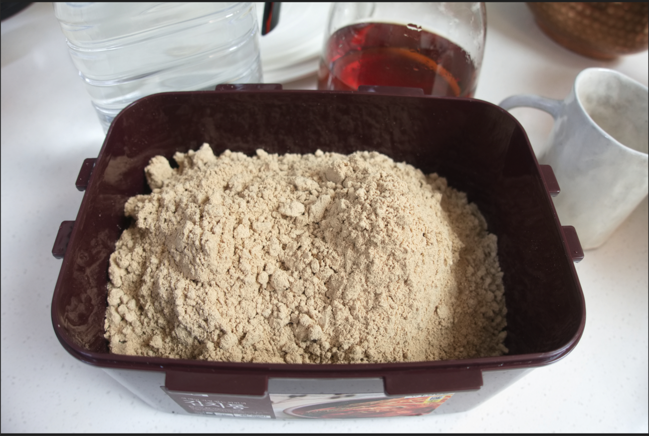 500그램으로 주문 했는데 2리터 김치 용기에 딱 맞게 들어간다. 약간 여유가 있어야 가루가 날리지 않는다.