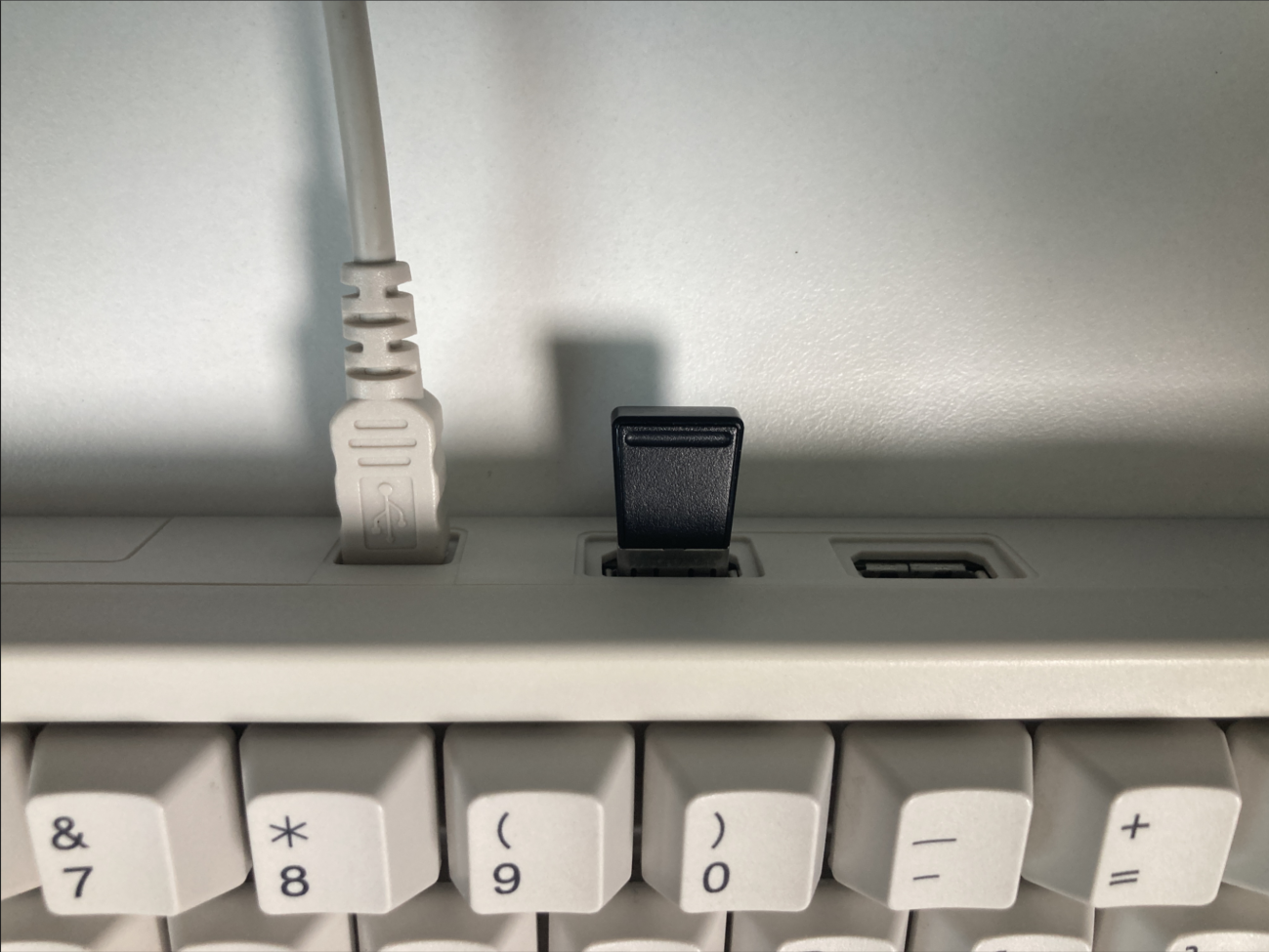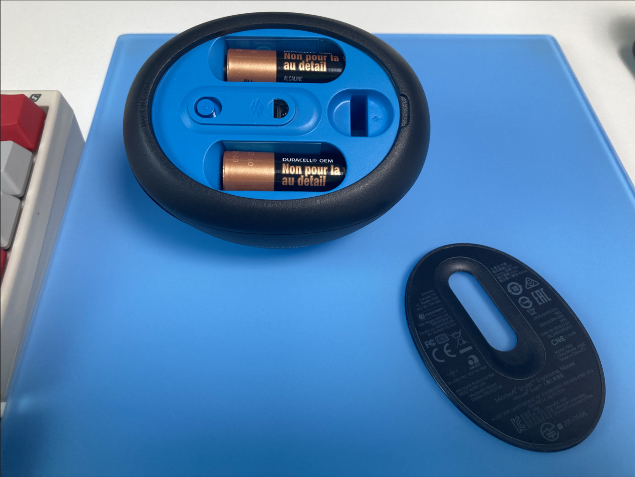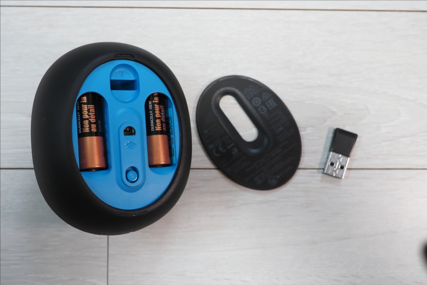 초기 상태의 제품 모습이다. 건전지 2개가 동봉 되어 있다. 동글도 내장되어 있는데 일반적인 사용에는 문제가 없는데 노트북에 동글을 사용한다면 몸통이 길어서 불편 할 것 같다.