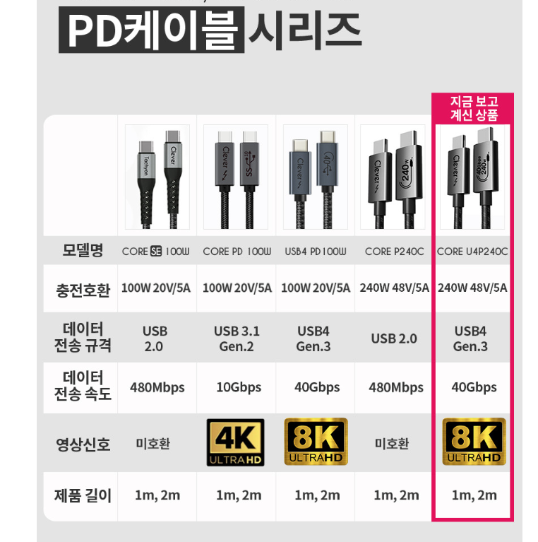 충전, 데이터 전송속도, 영상신호 등에 따라 나뉘어 지는 것을 볼 수 있다.