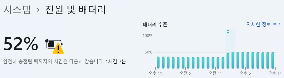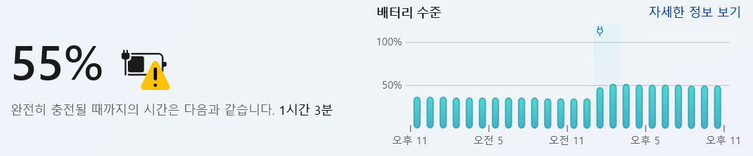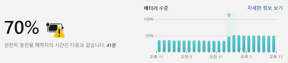 ▶ 요약: 40%에서 시작 해 70%에서 끝났다. 약 50분 소요, 즉 외부에서 최소 2시간은 사용 가능하다.
