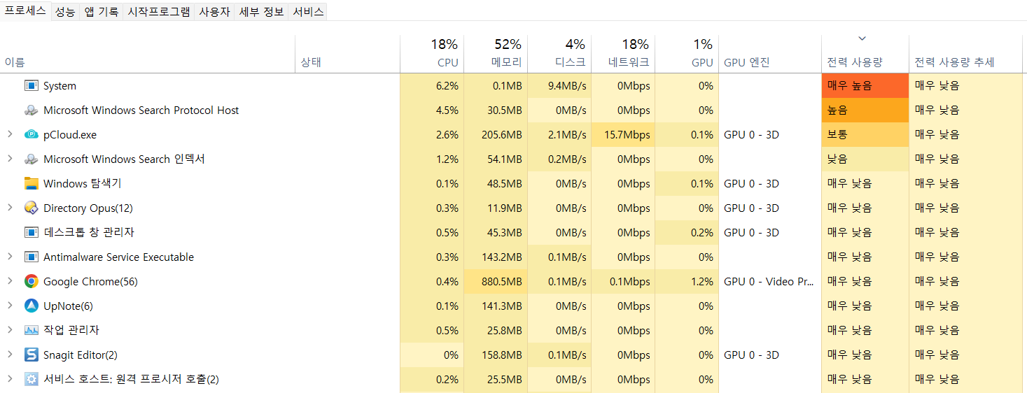 윈도우 자체의 검색 색인 작업 시 전력을 상당히 많이 사용하는 것을 알 수 있다. 배터리로만 사용 할 때 는 색인 서비스를 중지 해두는 게 좋을 것 같다.