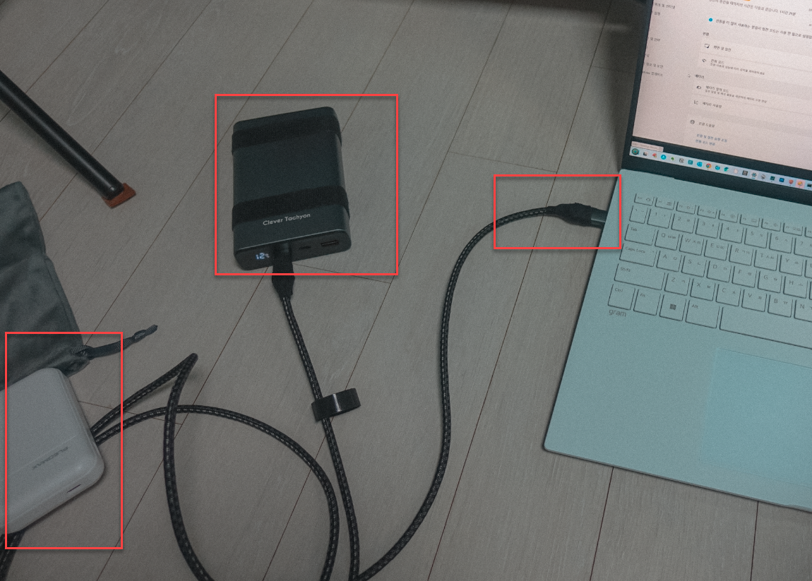 클레버타키온 보조배터리는 자체 충전을 하면서 다른 장비의 충전도 가능하다. 상당히 편리한 기능인데 실제 나에게 필요 없는 기능이다. 어쩌다 외부에서 급하게 노트북을 사용 할 때만 사용할 목적이기 때문이다.