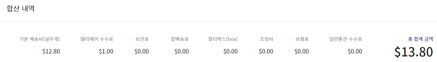 배송료는 13.80 달러다. 다음에 해외 직구가 필요하다면 몰테일 통해서 캘리포니아로 보내야겠다.