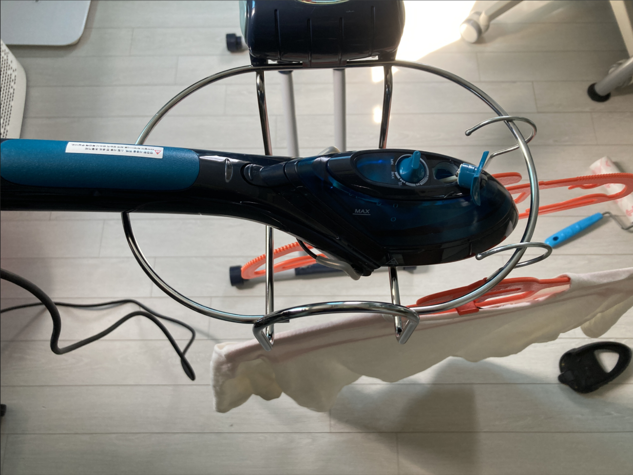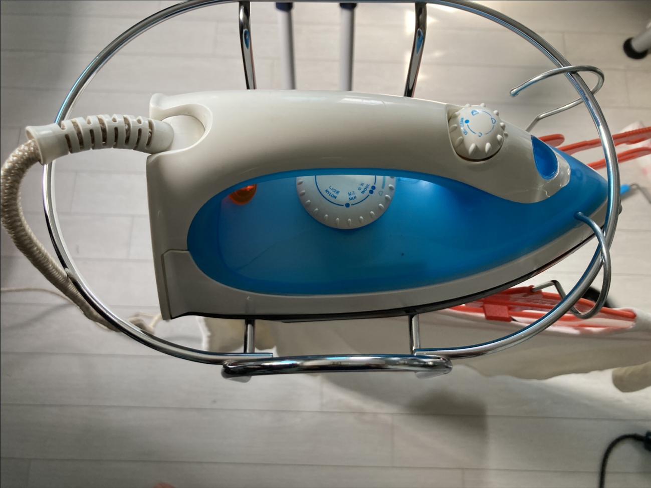 오래 된 스팀 다리미인데, 분문기가 필요 없으니 확실히 편하다. 오래되다 보니 세워 임시 거치하지 않고 다리미 케이지에 눕혀서 몇 분 거치하니 다시 다릴 때 물이 쏟아진다. 다리미를 최신형으로 교체해야 할 듯 하다.