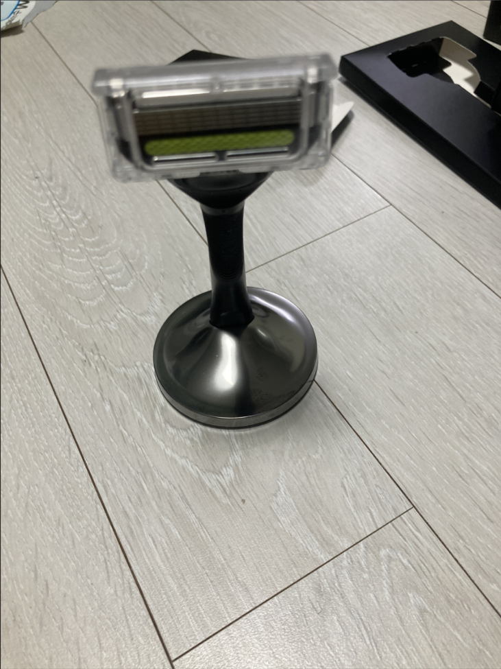 견고하지 않지만 받침대도 있다. 거치 방식으로 세워서 청결하게 면도기를 욕실에서 보관 할 수 있다.