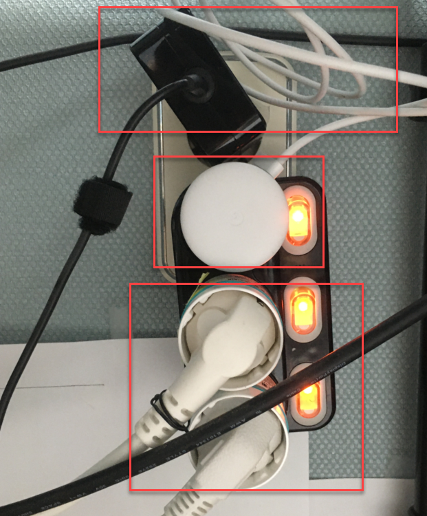 차례대로 TV, PC 연결 된 멀티탭이다.  당연하겠지만, 공유기와 구글홈미니 상시전원을 공급해야 한다.