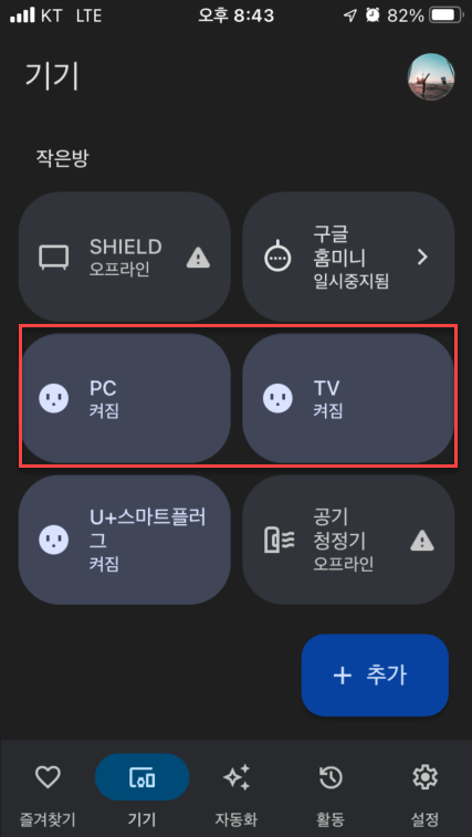 구글홈 앱에 추가한 모습이다. 기본 플러그 1, 2로 추가되는데 PC, TV로 변경 했다.