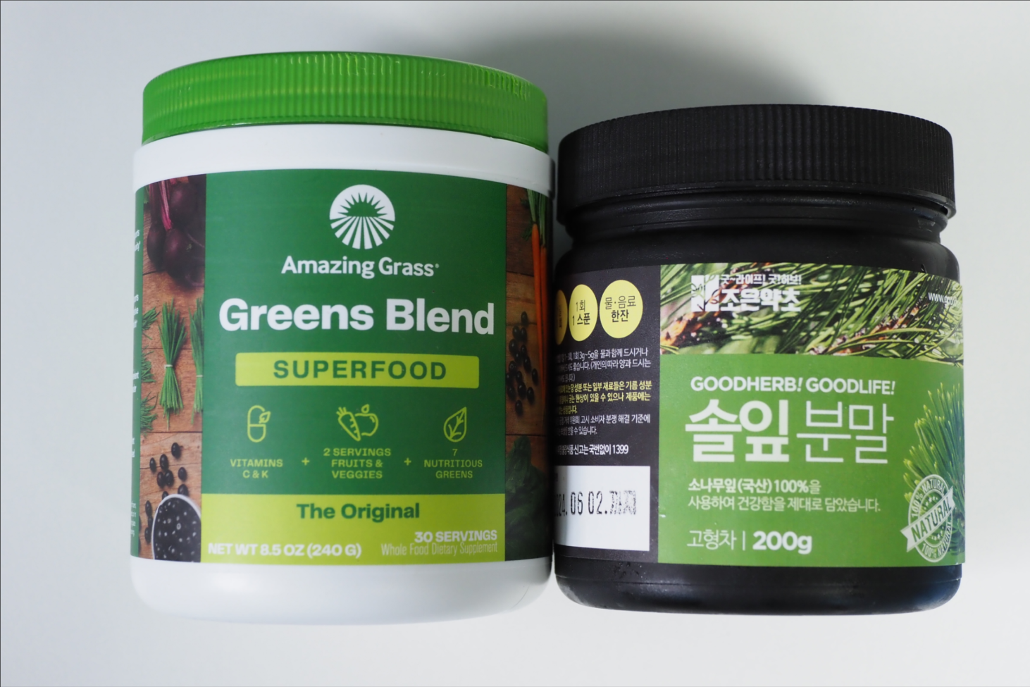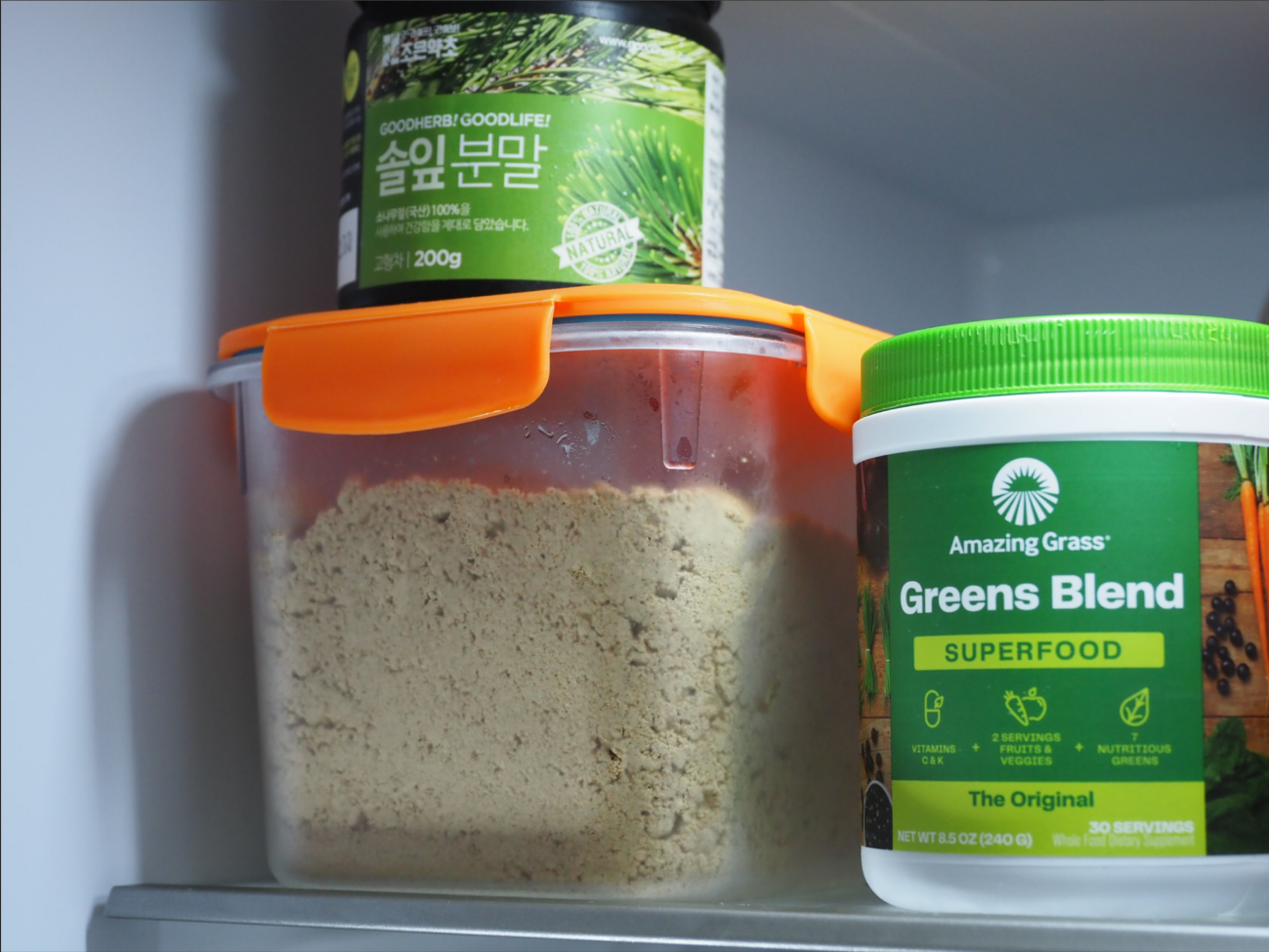 선식을 통해서 곡물의 좋은 성분을 흡수하고 엽록소 가루를 통해서 채소의 좋은 성분을 흡수한다.