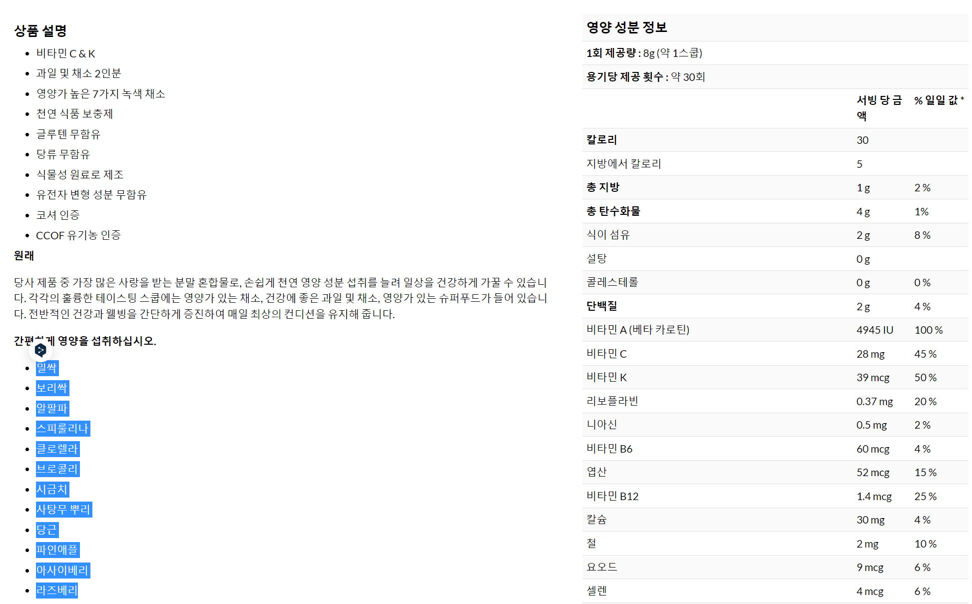 ▶키워드: 비타민, 선식, 엽록소, 채소, 야채, 천연합성, 인공