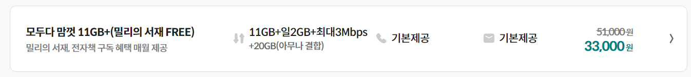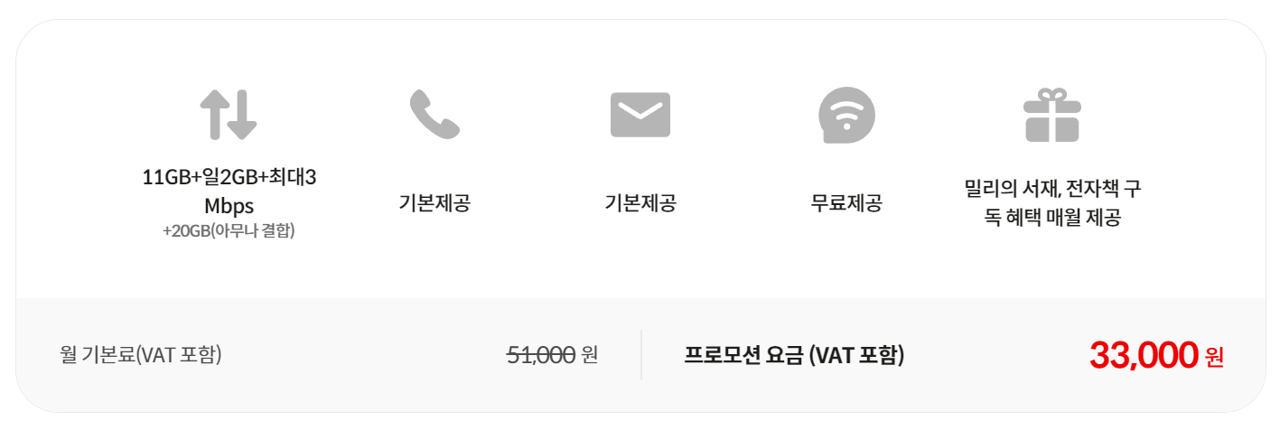 - 데이터 속도: 한달 11GB 소진 후 하루 2GB 빠르게 사용하다 소진 시 3Mbps로 속도 제한