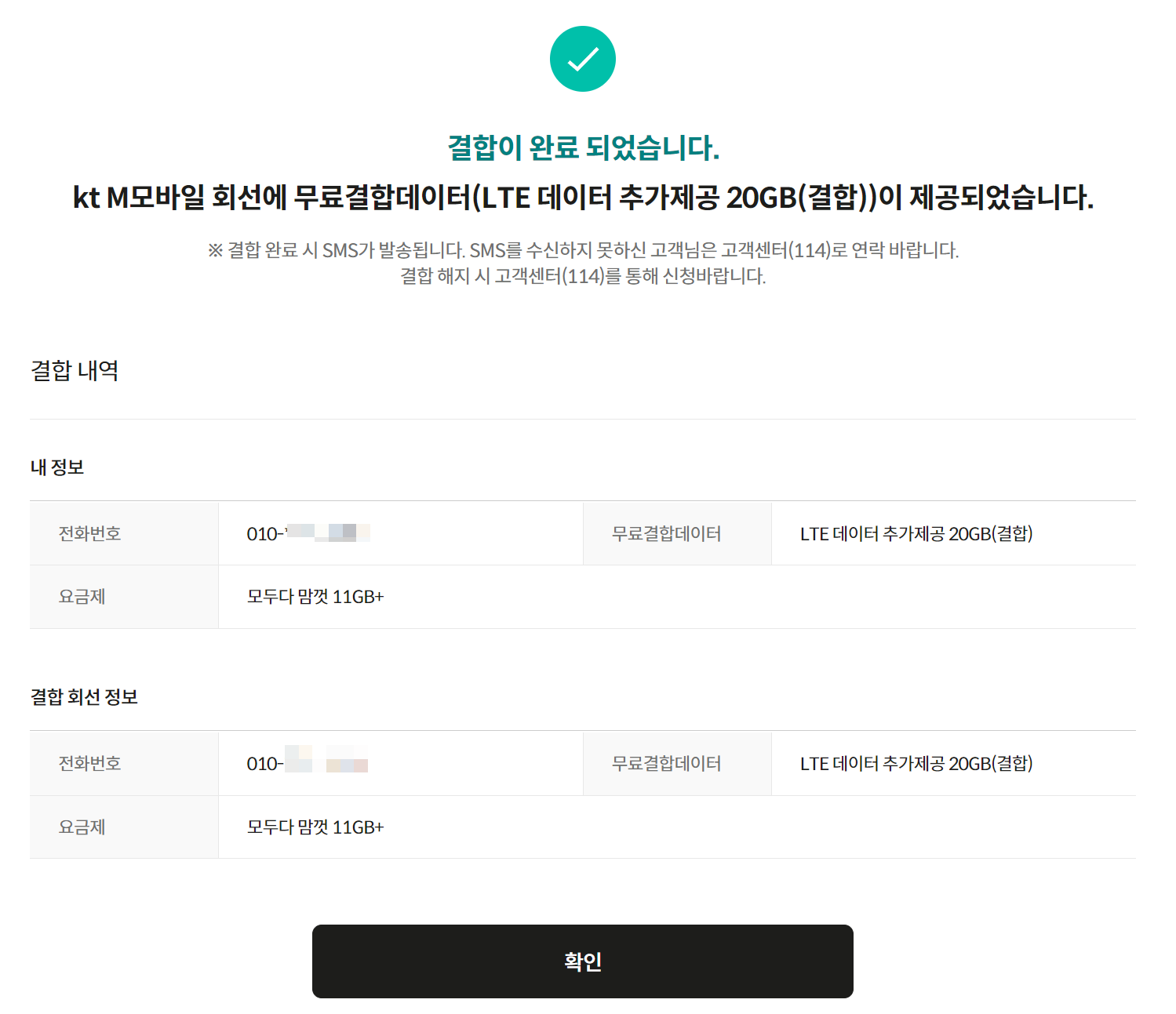 - 데이터 20GB 추가: 가족 중 한 명이 케이티엠모바일 사용한다면 ‘아무나결합' 신청 후 20GB 추가 사용 가능
