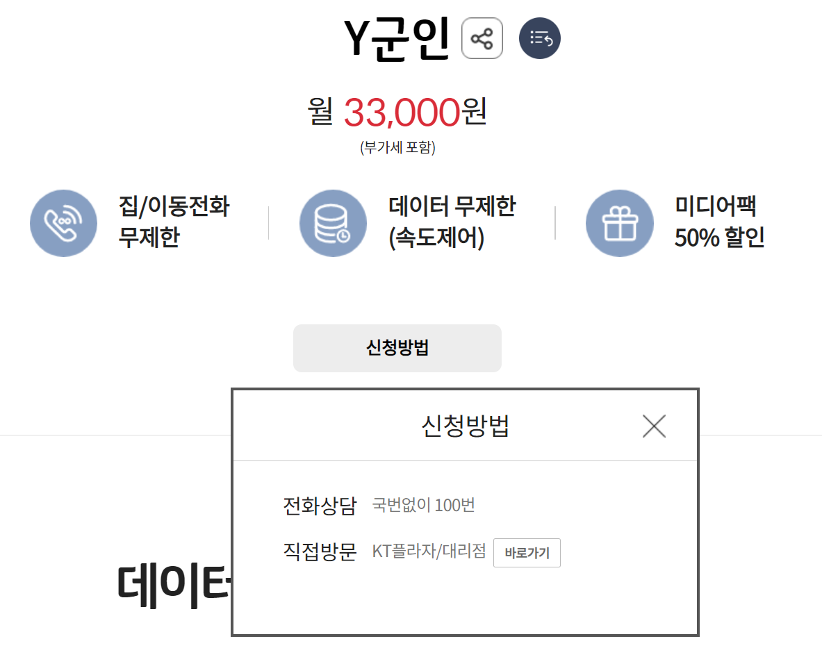 기간망 사업자인 케이티 “Y군인” 요금제 주요 특징