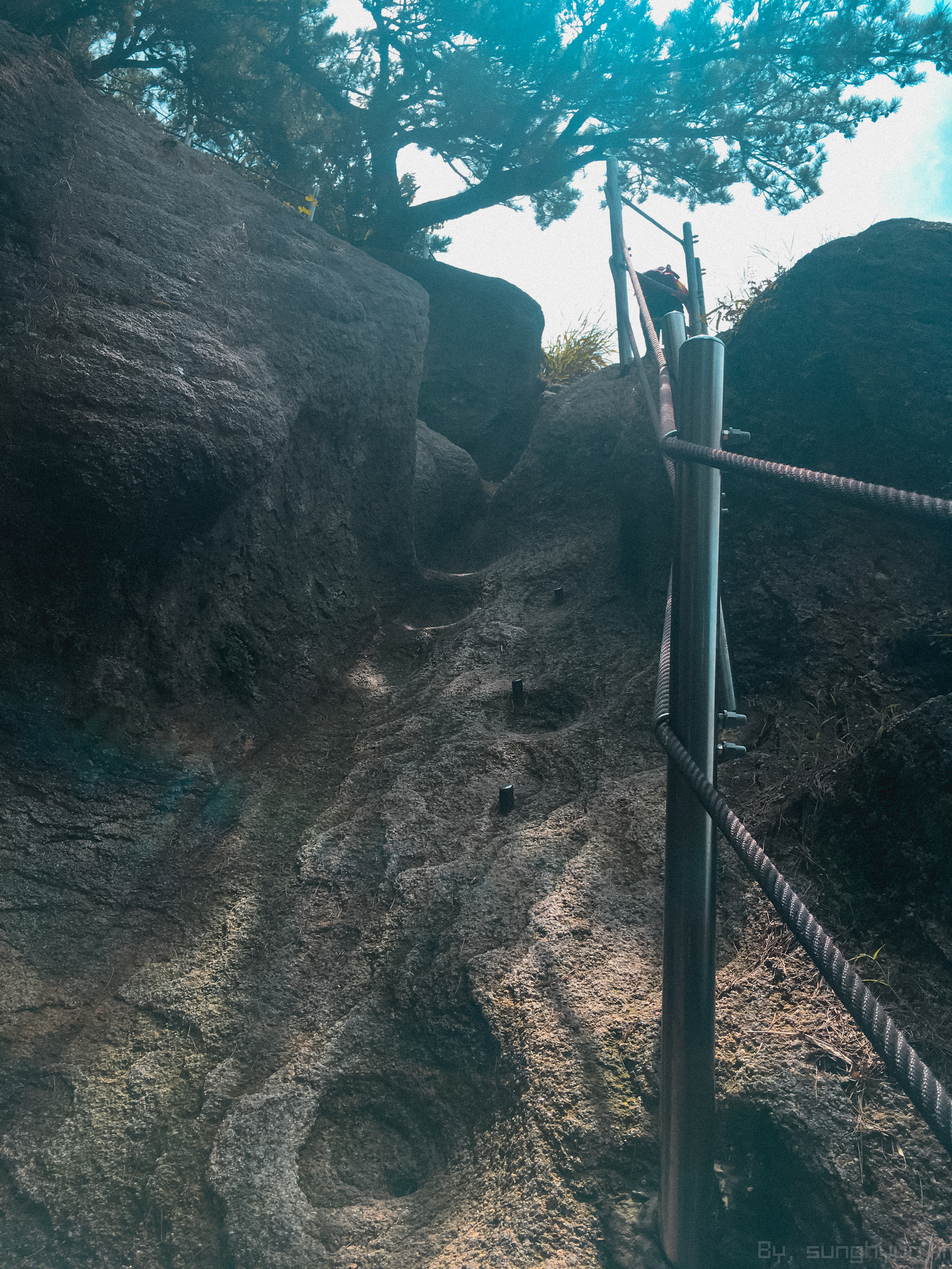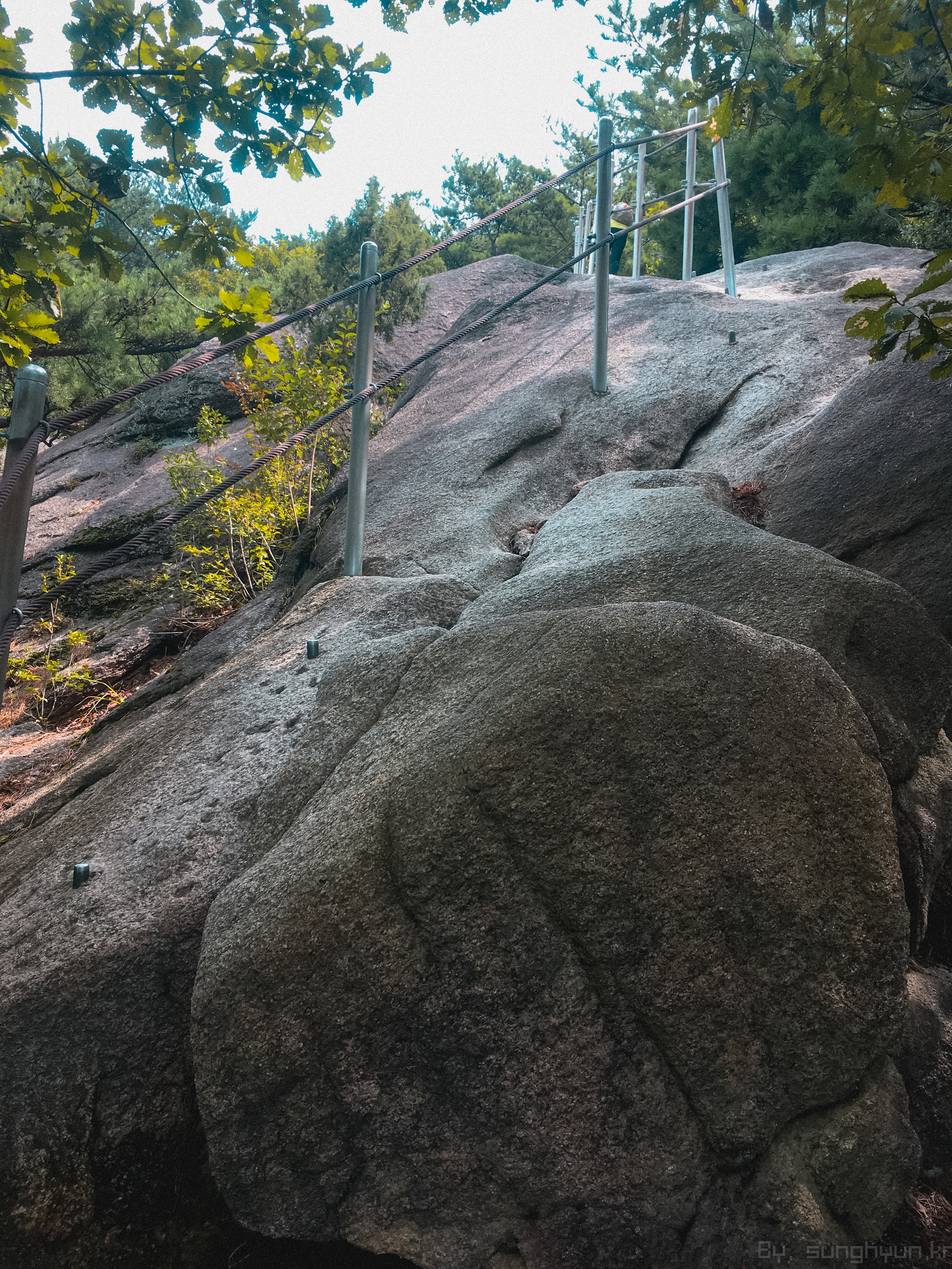 쇠줄과 바닥의 쇠기둥에 의지 해서 올랐다. 손에 힘을 많이 주지 않기 위해 신경을 섰는데, 나중에 보니 오히려 허벅지에 힘을 많이 줘서 정상 부근에서 잠길 뻔 했다.