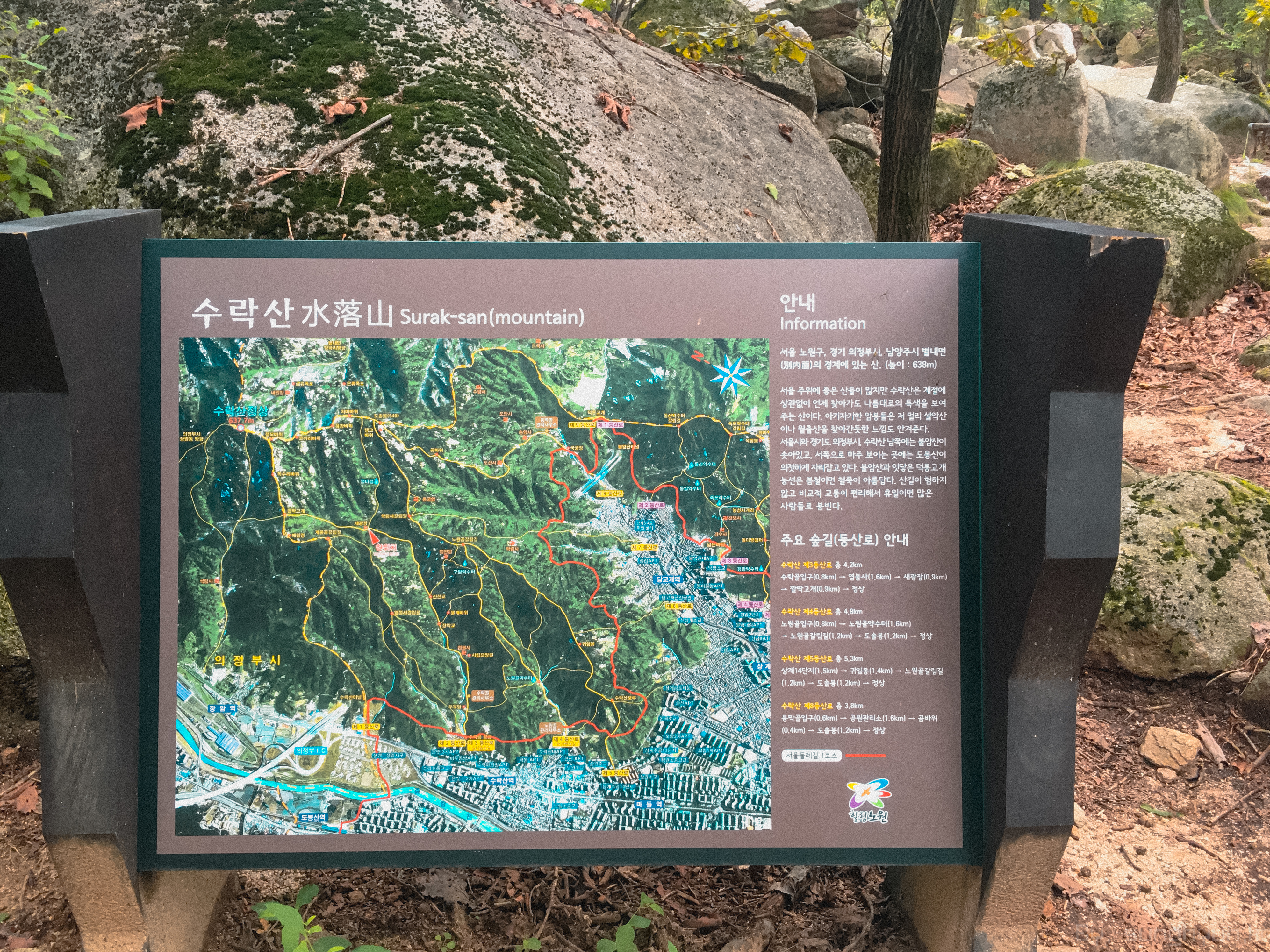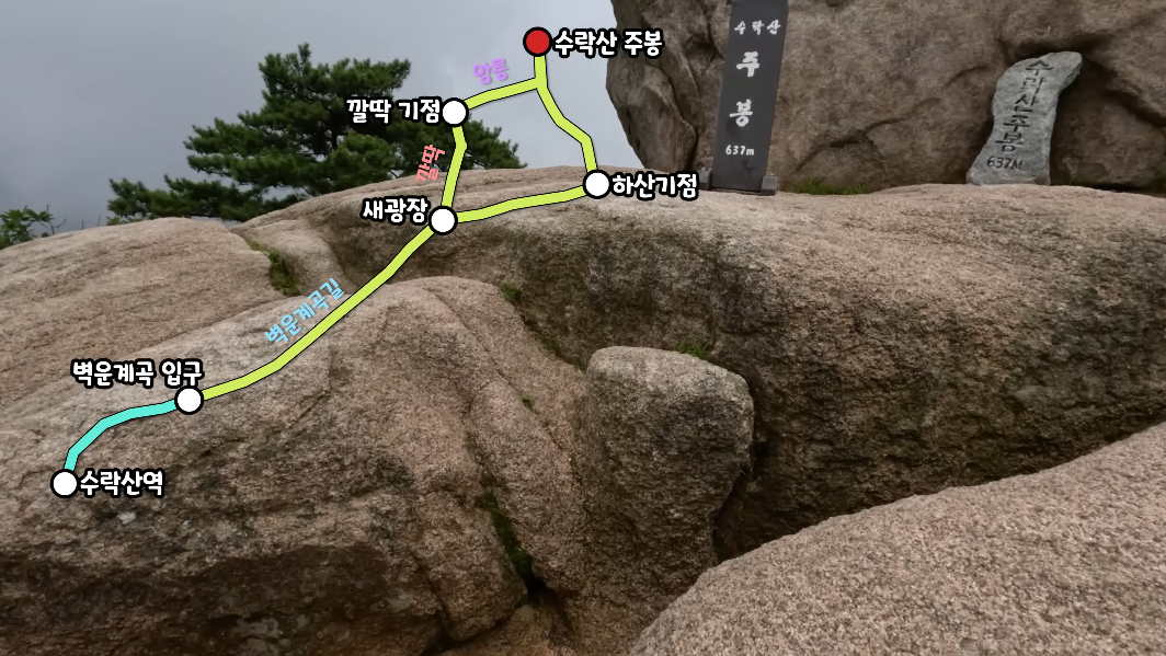 등산: 수락산역 1번 출구 - 도보 5분 이동 - 수락산 벽운계곡(우회전) - 수락벽운계곡길 - 수락산정상(새광장) - 깔딱기점(암릉구간) - 수락산 주봉